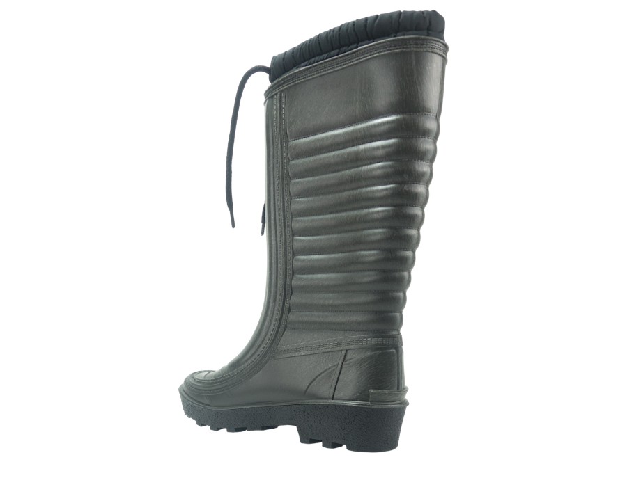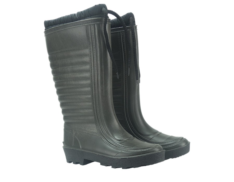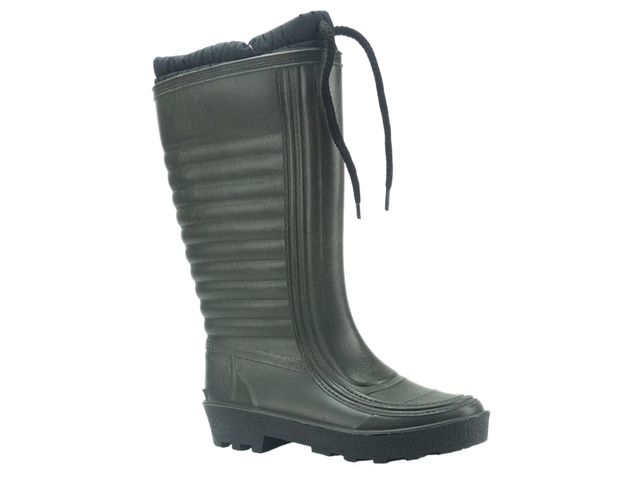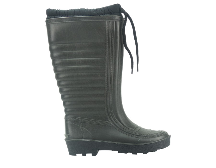 Ανδρική ψηλή γαλότσα ελληνικής κατασκευής σε πράσινο χρώμα με δέσιμο και γούνινη εσωτερική επένδυση.