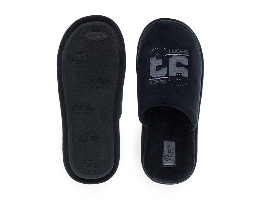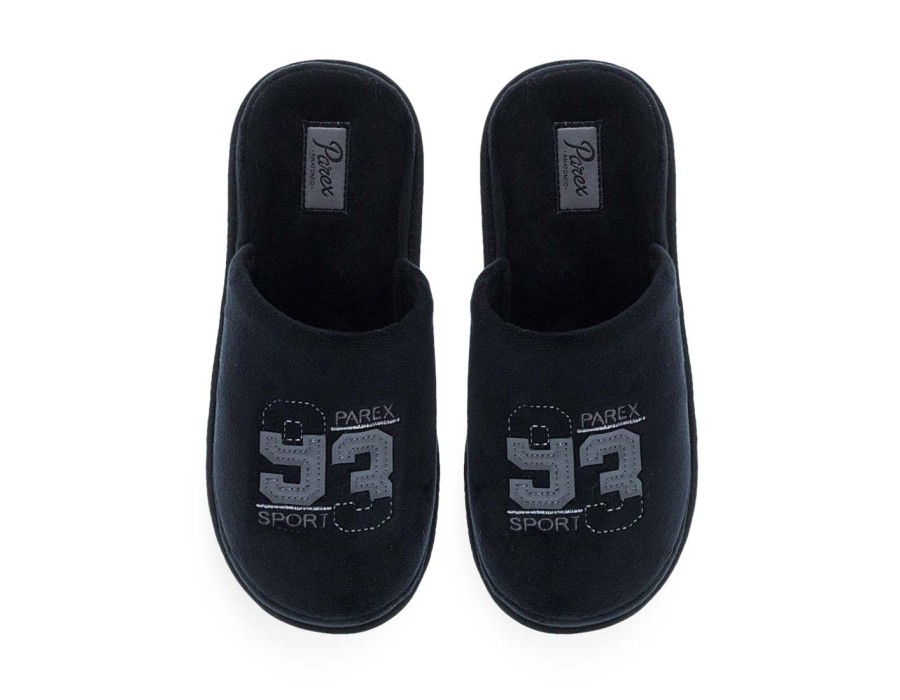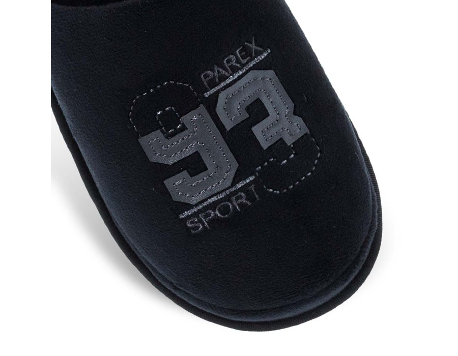 Ανδρικές παντόφλες σπιτιού Parex. Ανδρικές παντόφλες Parex σε μαύρο και μπλε χρώμα με τύπωμα «SPORT 93». Ανατομικές, άνετες και ελαφριές, ιδανικές για καθημερινή χρήση.