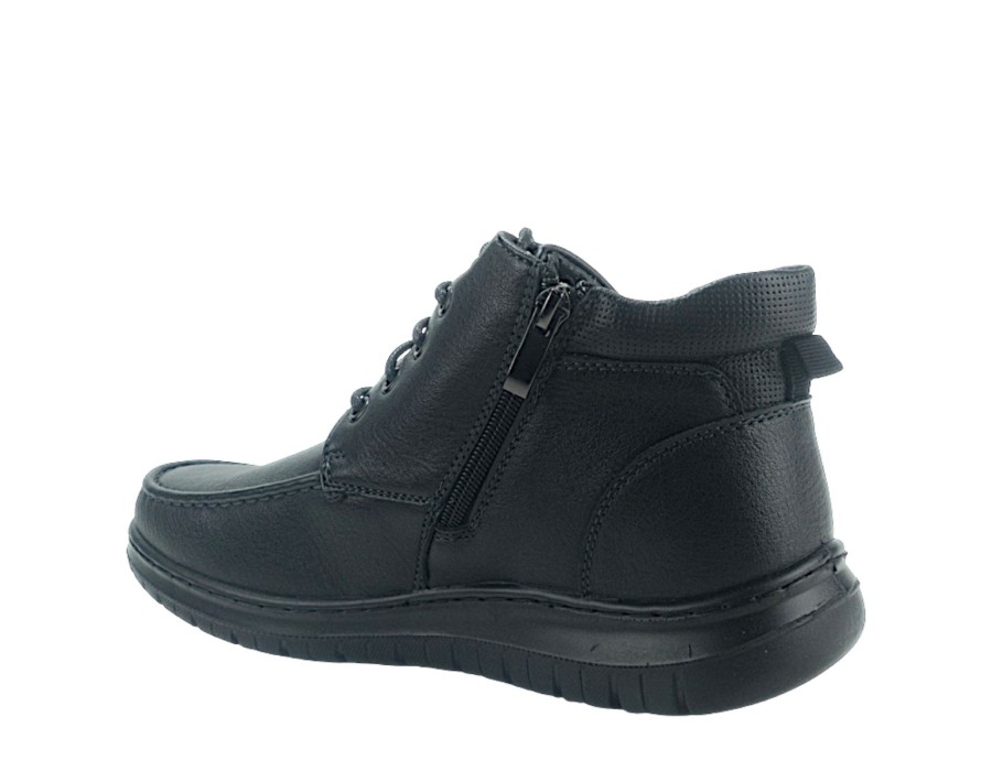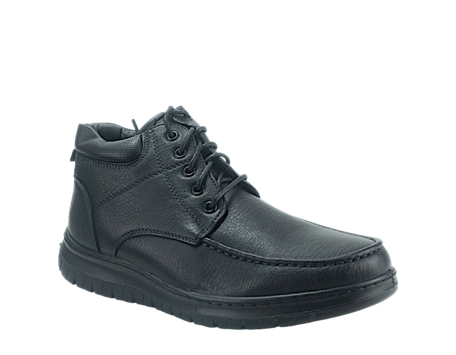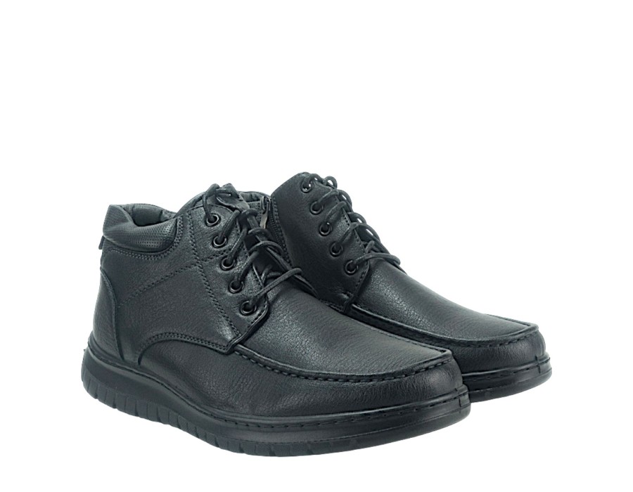 Ανδρικά μποτάκια σε μαύρο χρώμα. Είναι κατασκευασμένα από συνθετικό δέρμα και ύφασμα.