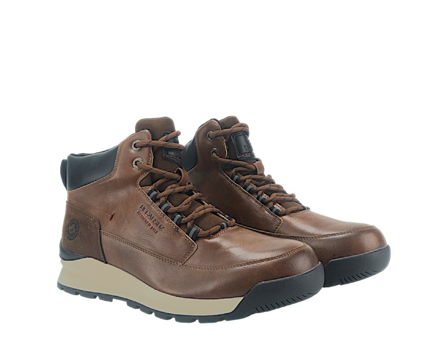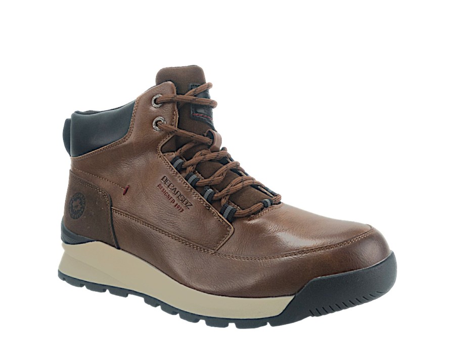 Ανδρικά μποτάκια σε καφέ χρώμα. Είναι κατασκευασμένα από συνθετικό δέρμα και ύφασμα.