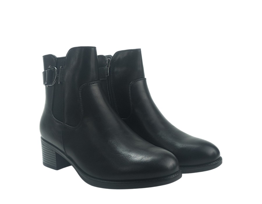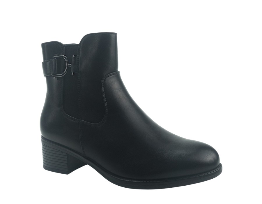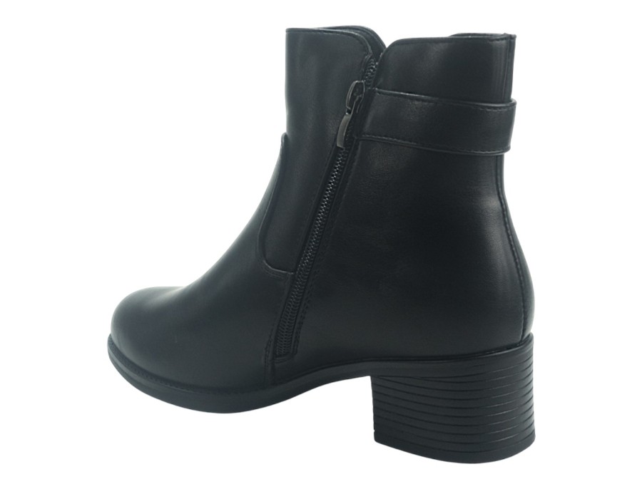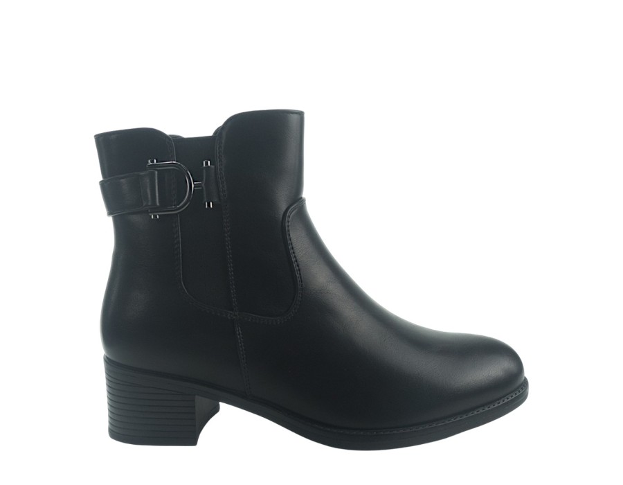 Γυναικείο μποτάκι σε μαύρο χρώμα. Κατασκευασμένο από συνθετικό δέρμα υψηλής ποιότητας. Το ύψος του τακουνιού είναι 4,5 εκ.