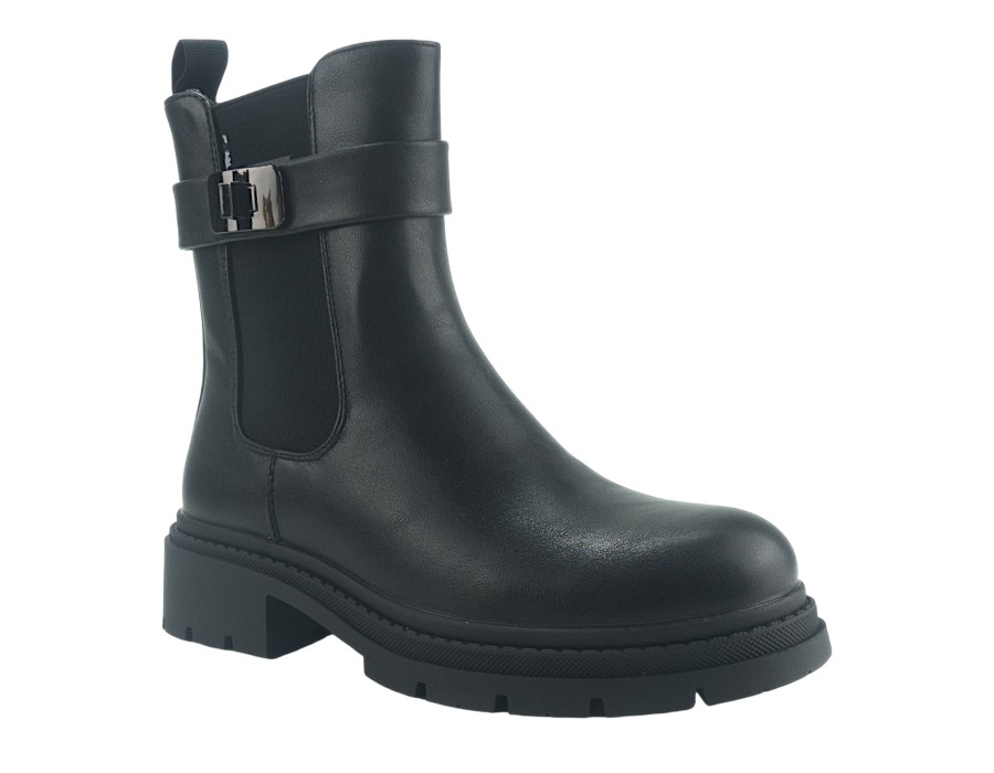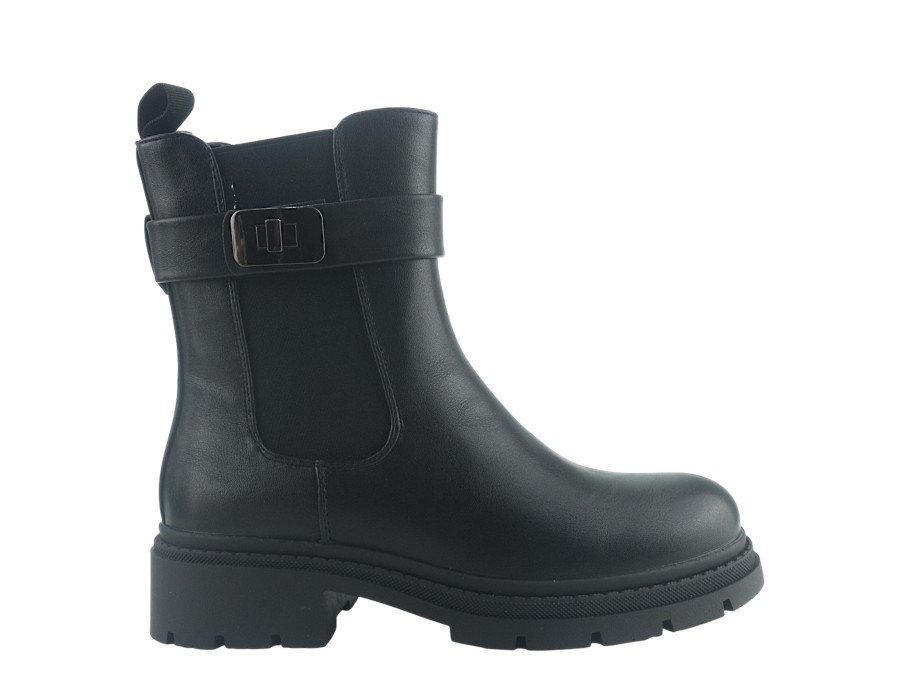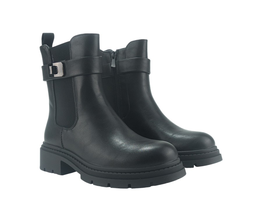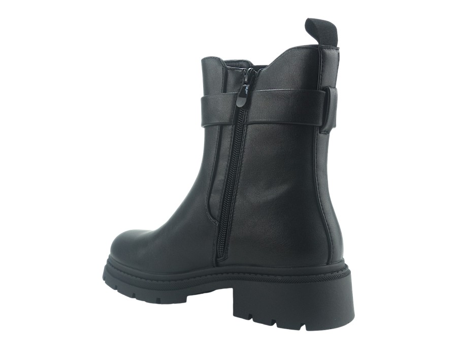 Γυναικείο μποτάκι σε μαύρο χρώμα. Κατασκευασμένο από συνθετικό δέρμα υψηλής ποιότητας. Το ύψος του τακουνιού είναι 5 εκ.