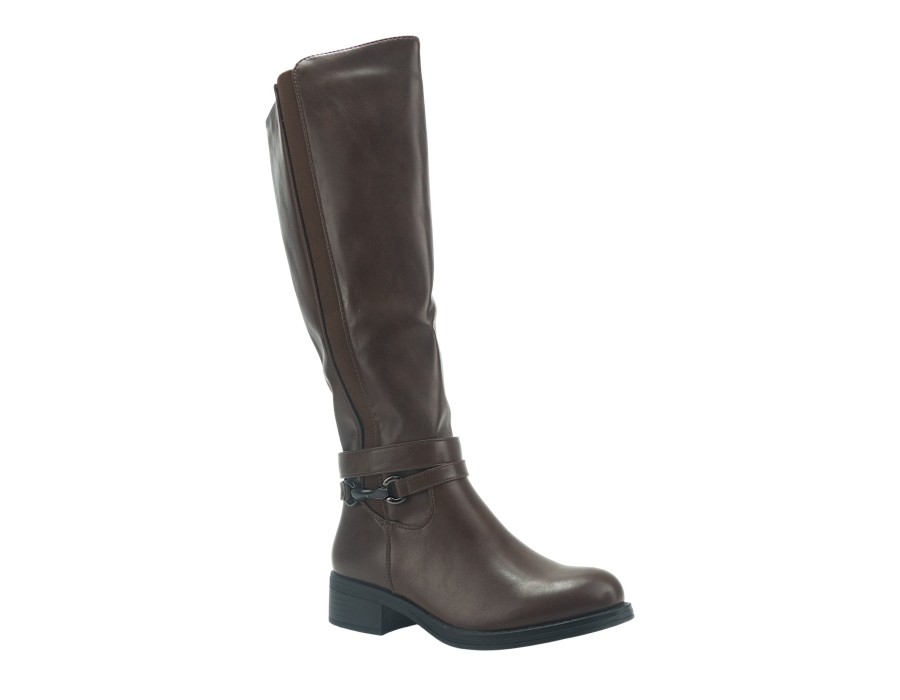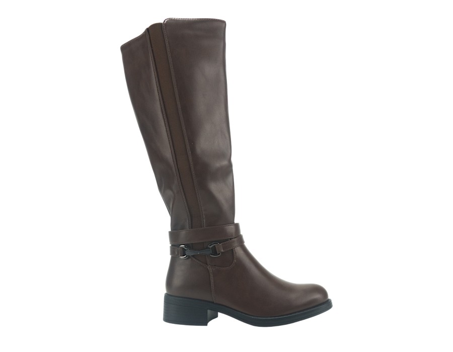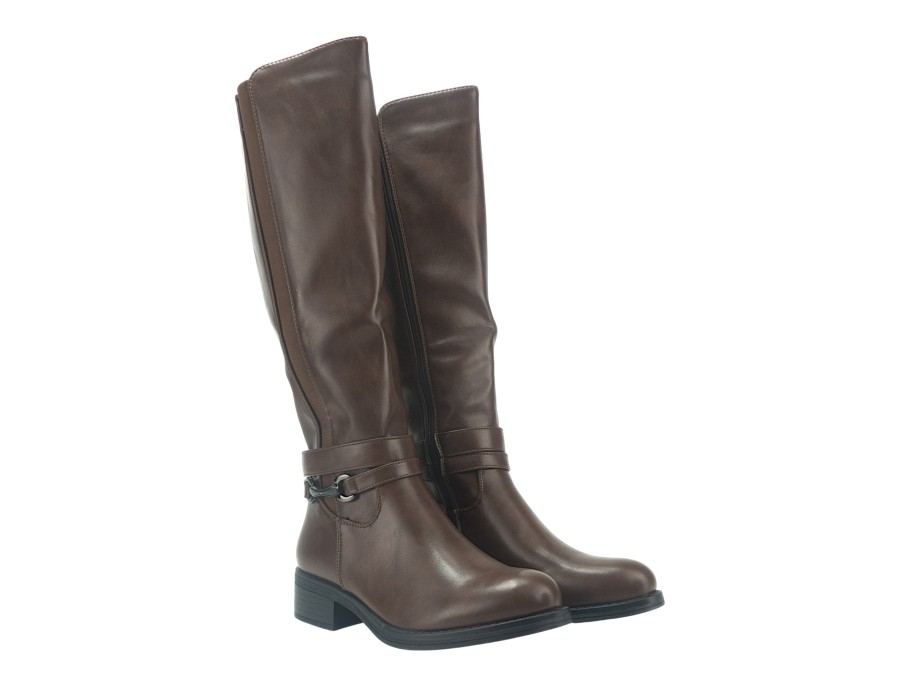 Γυναικεία μπότα σε καφέ χρώμα. Κατασκευασμένη από συνθετικό δέρμα υψηλής ποιότητας. Το ύψος του τακουνιού είναι 4 εκ.