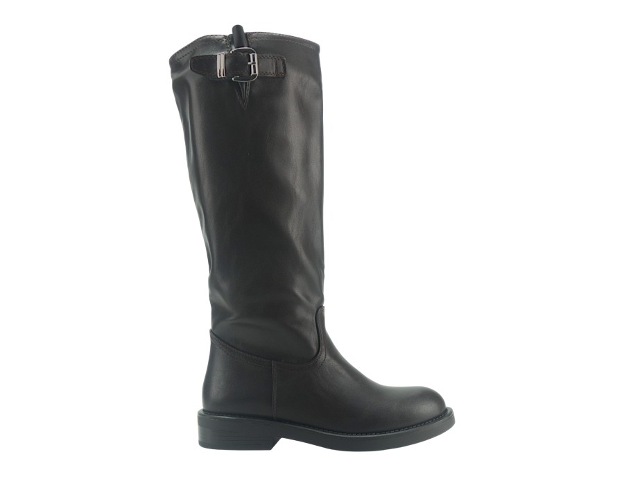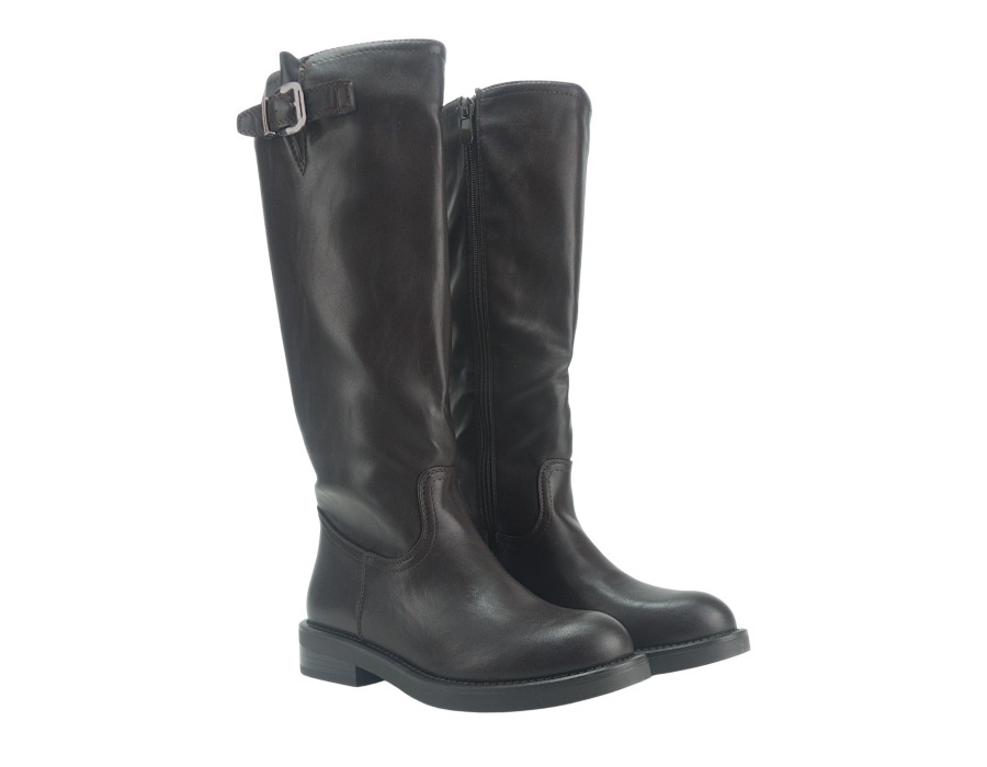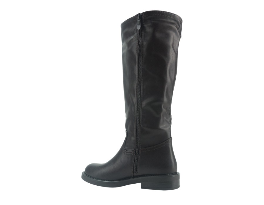 Γυναικεία μπότα σε καφέ χρώμα. Κατασκευασμένη από συνθετικό δέρμα υψηλής ποιότητας. Το ύψος του τακουνιού είναι 3 εκ.