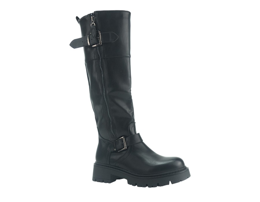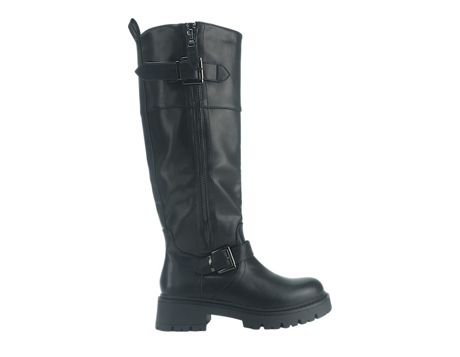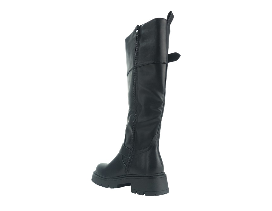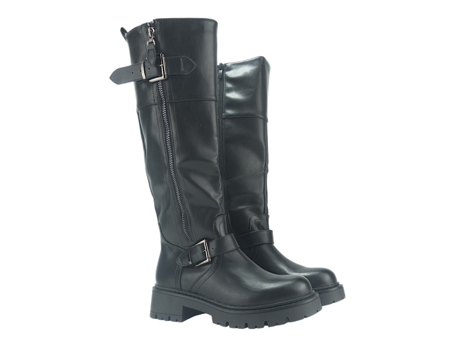 Γυναικεία μπότα σε μαύρο χρώμα. Κατασκευασμένη από συνθετικό δέρμα υψηλής ποιότητας. Το ύψος του τακουνιού είναι 5 εκ.