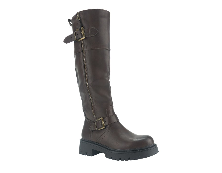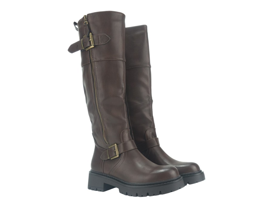 Γυναικεία μπότα σε καφέ χρώμα. Κατασκευασμένη από συνθετικό δέρμα υψηλής ποιότητας. Το ύψος του τακουνιού είναι 5 εκ.
