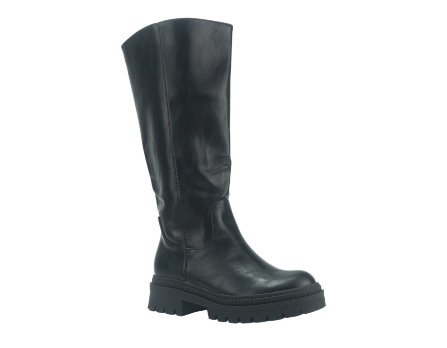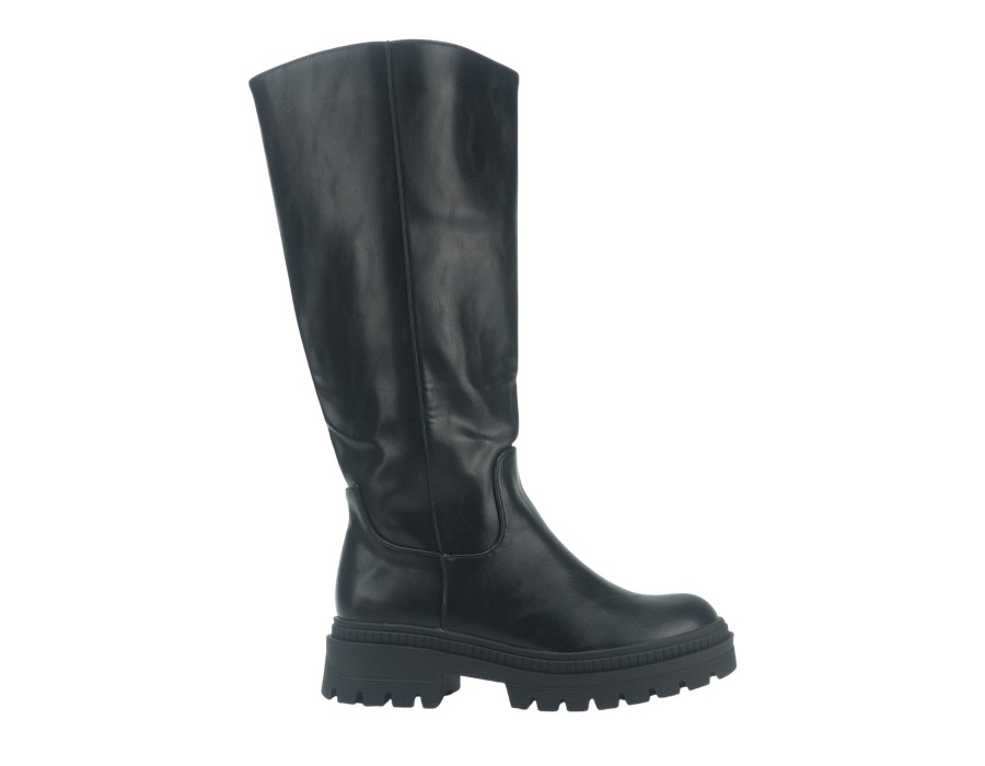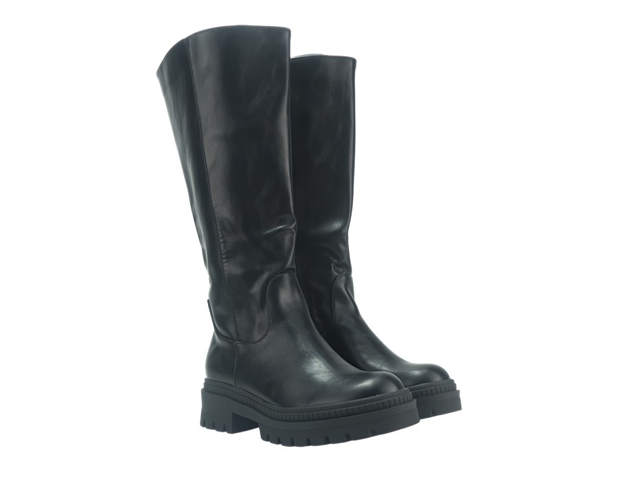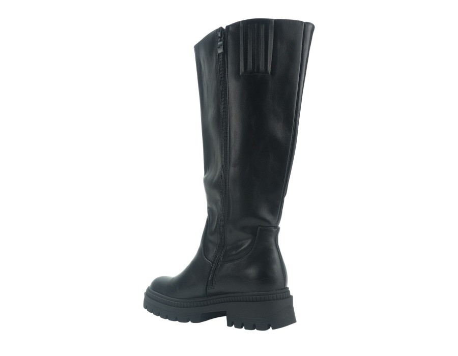 Γυναικεία μπότα σε μαύρο χρώμα. Κατασκευασμένη από συνθετικό δέρμα υψηλής ποιότητας. Το ύψος του τακουνιού είναι 5 εκ.