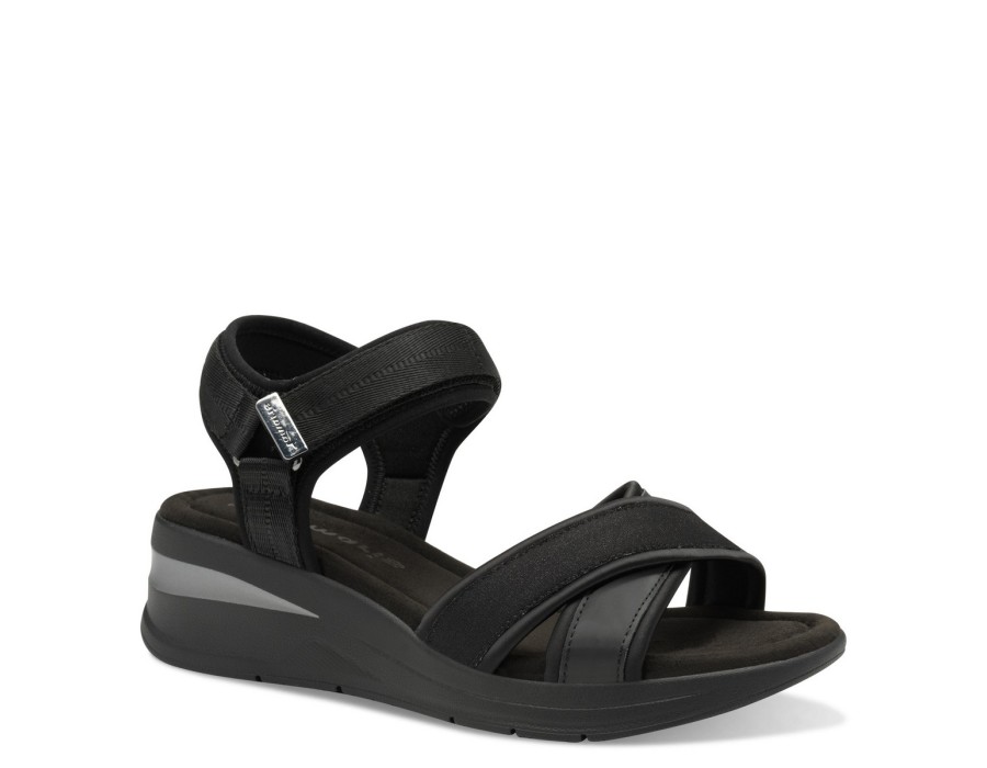 Γυναικεία πέδιλα μαύρα κατασκευασμένα από συνθετικό δέρμα υψηλής ποιότητας του οίκου TAMARIS και ύφασμα, έχουν ύψος τακουνιού 5 εκατοστά, ενώ διαθέτουν τεχνολογία TOUCH-IT που τα καθιστά πολύ άνετα καθώς διαθέτουν έναν πολύ μαλακό πάτο.