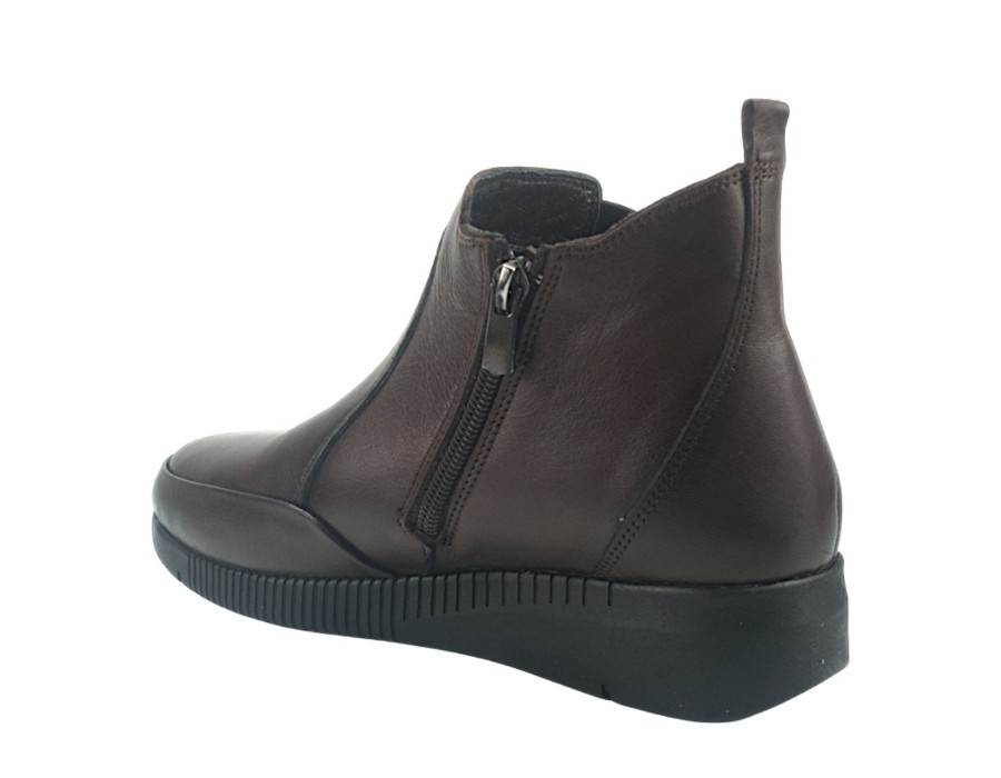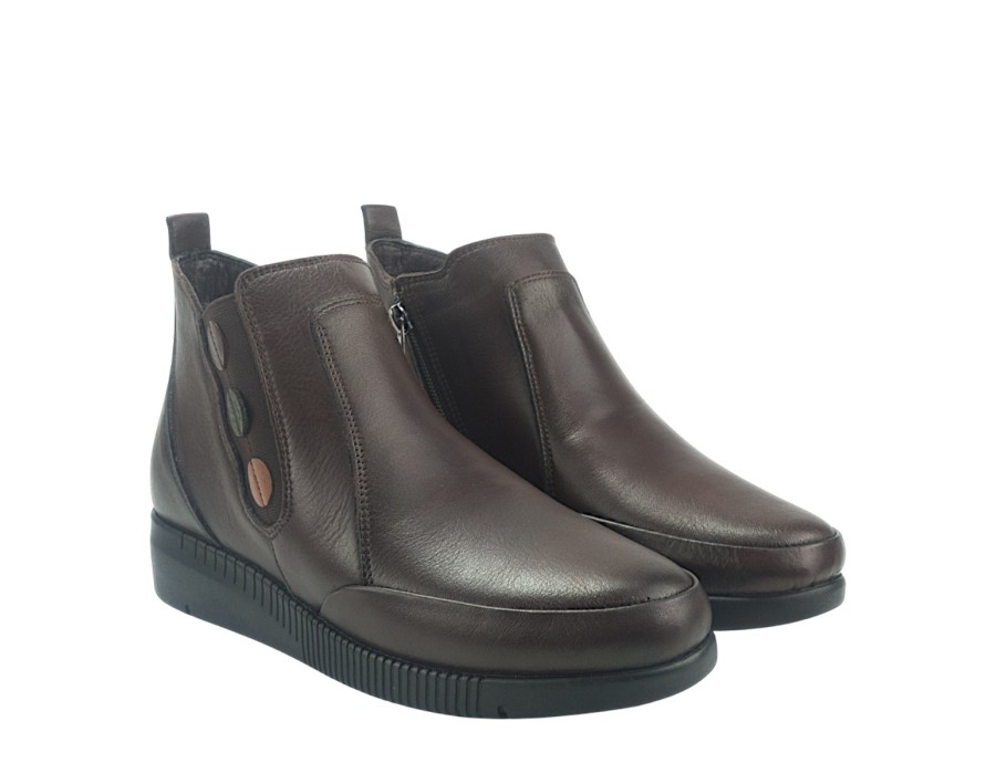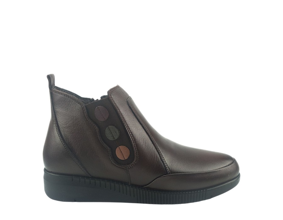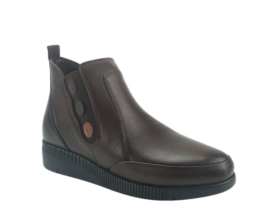 Γυναικείο μποτάκι σε καφέ χρώμα, κατασκευασμένο από δέρμα και ύφασμα. Με αντιολισθητικό και μαλακό πάτο. Το ύψος του τακουνιού είναι 3,5 εκ.