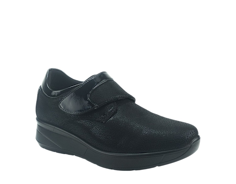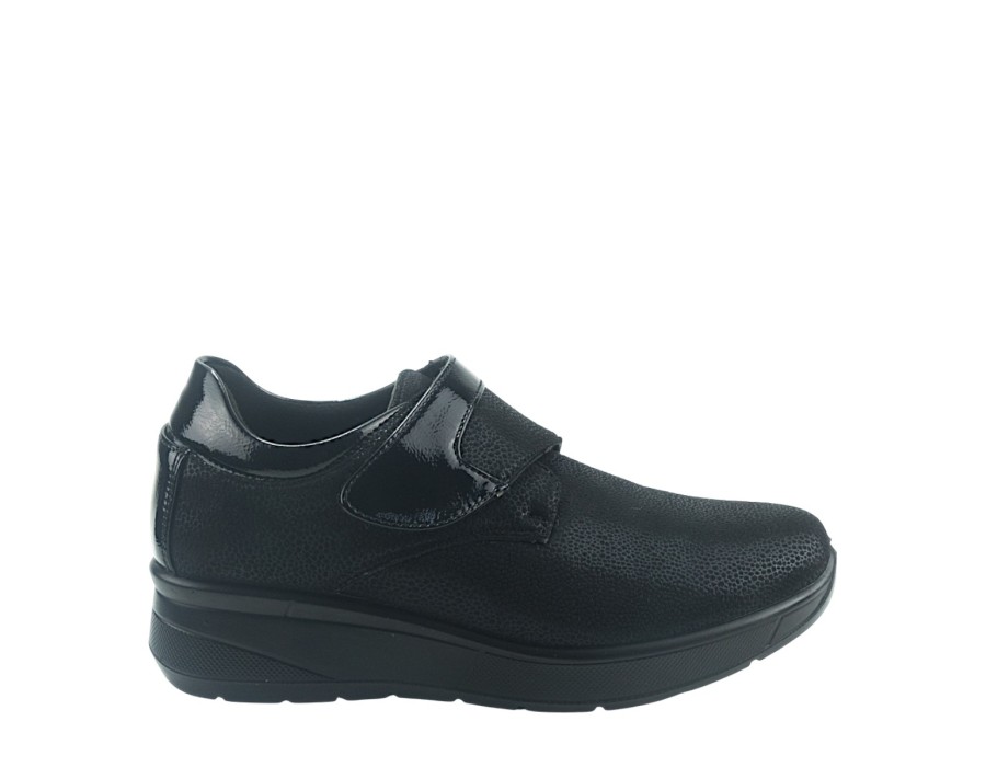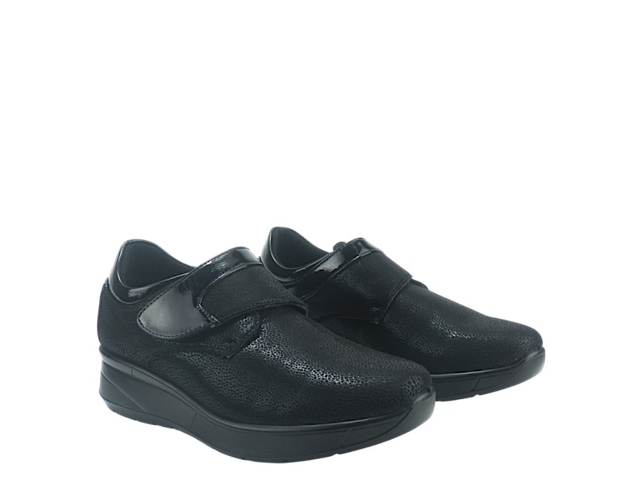 Γυναικεία loafers από συνθετικό δέρμα και ύφασμα σε μαύρο χρώμα. Διαθέτουν χαμηλό τακούνι για άνετα βήματα