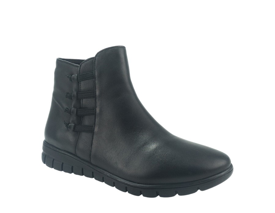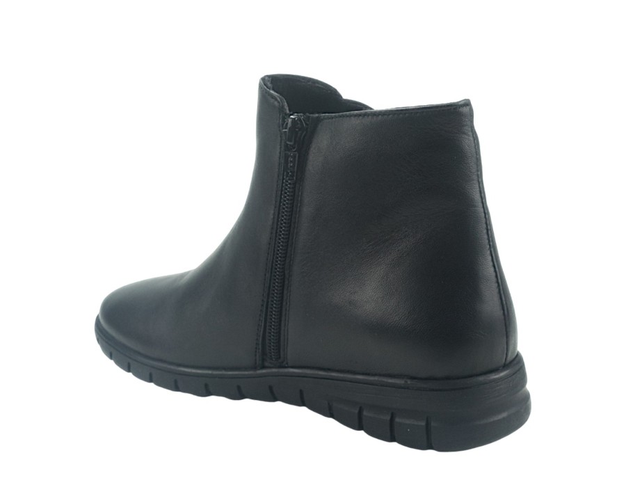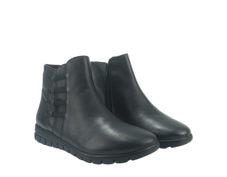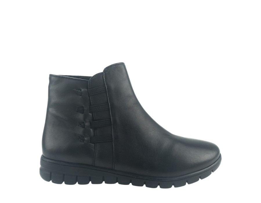 Γυναικείο μποτάκι σε μαύρο χρώμα, κατασκευασμένο από δέρμα και ύφασμα. Με αντιολισθητικό και μαλακό πάτο. Το ύψος του τακουνιού είναι 3 εκ.