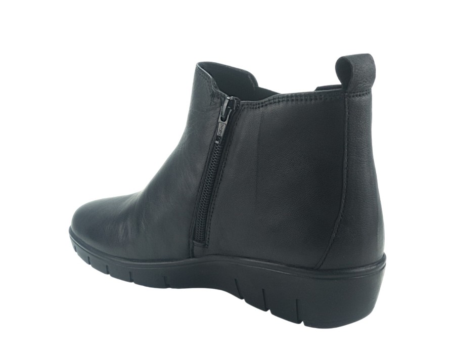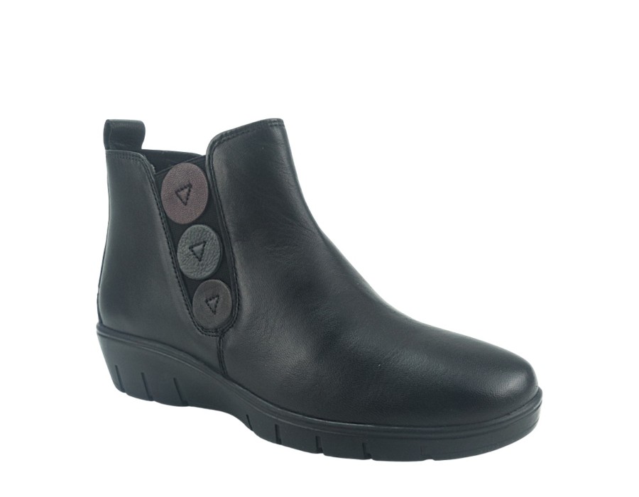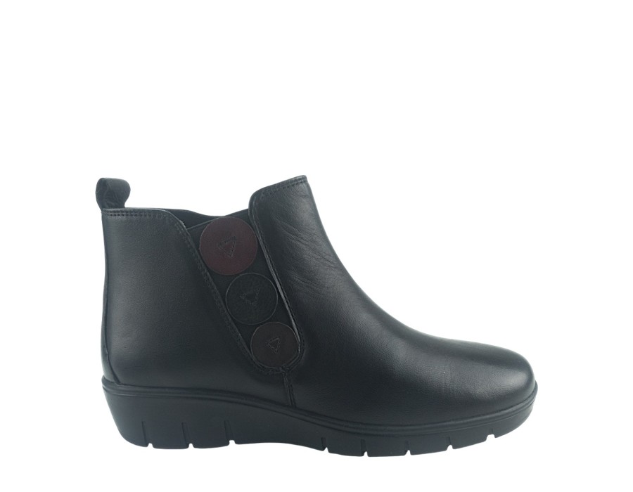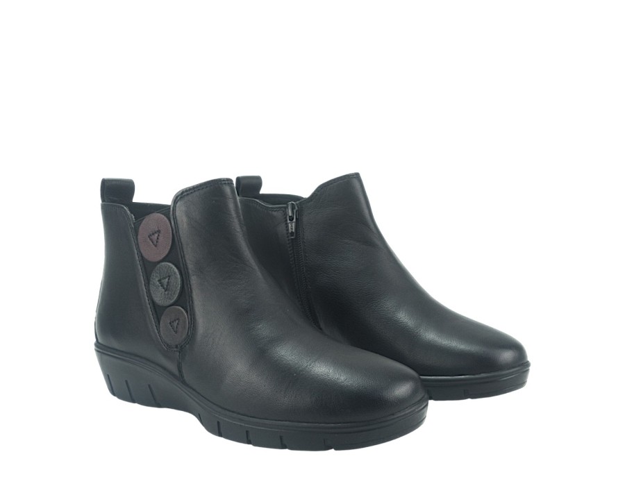 Γυναικείο μποτάκι σε μαύρο χρώμα, κατασκευασμένο από δέρμα και ύφασμα. Με αντιολισθητικό και μαλακό πάτο. Το ύψος του τακουνιού είναι 4 εκ.