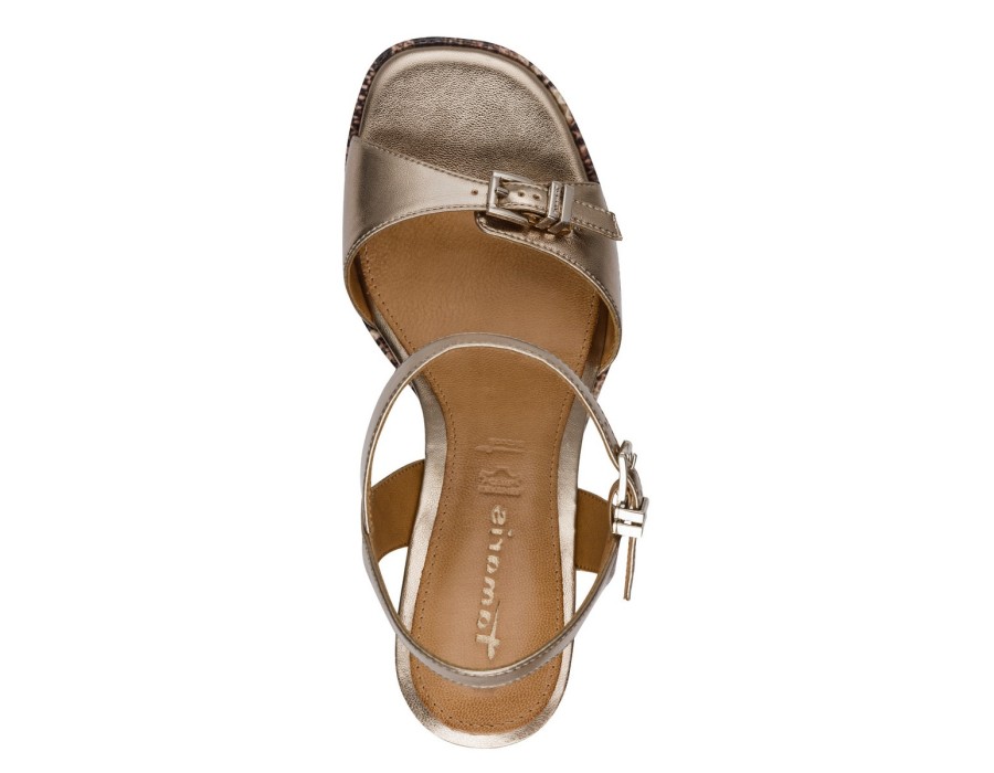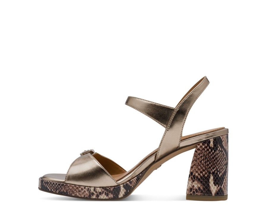 Καλοκαιρινά γυναικεία πέδιλα Tamaris σε μπρονζέ χρώμα με snake print. Κατασκευασμένα από υψηλής ποιότητας συνθετικό δέρμα, λουστρίνι, με ύψος τακουνιού 8 εκ. Διαθέτουν τεχνολογία TOUCH-IT/Anti-Slide με μαλακό πάτο για πιο ξεκούραστο περπάτημα