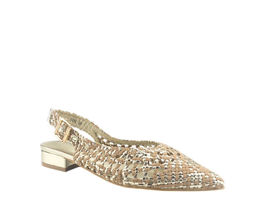 Γυναικεία mules της μάρκας Nikol σε χρυσό χρώμα. Κατασκευασμένα από συνθετικό δέρμα με ύψος τακουνιού 3 εκ. Άνετα και ευκολοφόρετα για όλη την ημέρα.