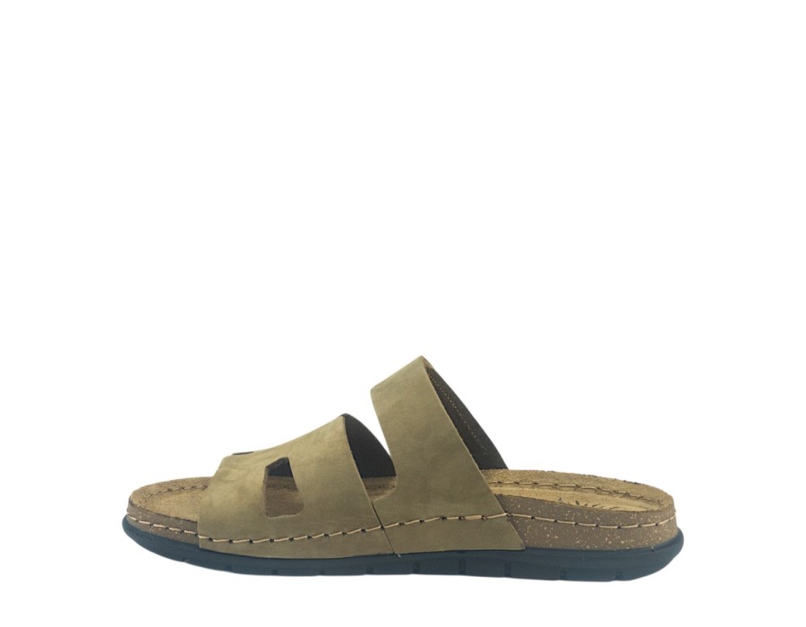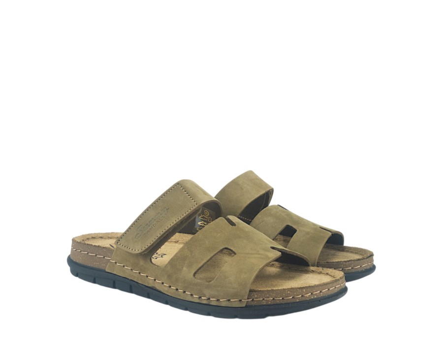 Γυναικείο σανδάλι σε λαδί χρώμα, είναι κατασκευασμένο από δέρμα nubuck που το καθιστούν πολύ άνετο και μαλακό. Το ύψος του τακουνιού είναι 3 εκ.