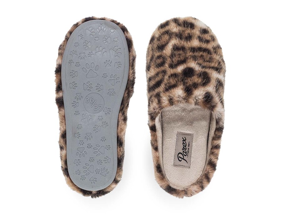 Γυναικείες παντόφλες σπιτιού Parex. Γυναικείες παντόφλες Parex με λεοπάρ σχέδιο και εξαιρετικά απαλή υφή. Άνετες και ζεστές για τον χειμώνα, με αντιολισθητική σόλα για σταθερό περπάτημα. Ιδανικές για καθημερινή χρήση στο σπίτι.