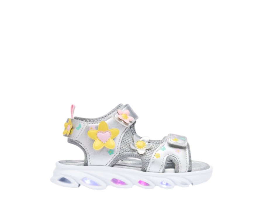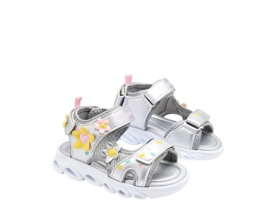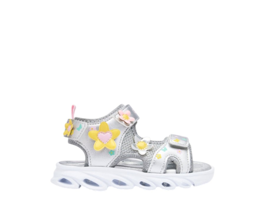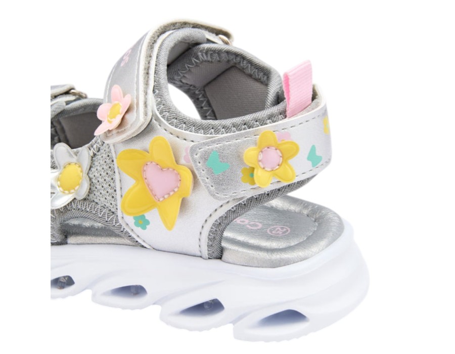 Φωτιζόμενα σανδάλια σε ασημί φινίρισμα , σχεδιασμένα για να προσφέρουν μια διασκεδαστική και φωτεινή πινελιά στις πιο ζεστές μέρες. Διαθέτουν ανάγλυφες λεπτομέρειες λουλουδιών που προσθέτουν ένα λεπτό και πρωτότυπο φινίρισμα, μαζί με μια φωτεινή σόλα που ενεργοποιείται με κάθε βήμα.