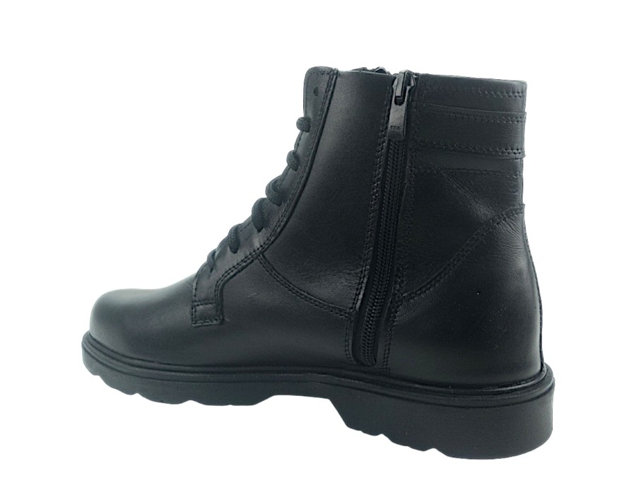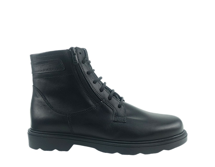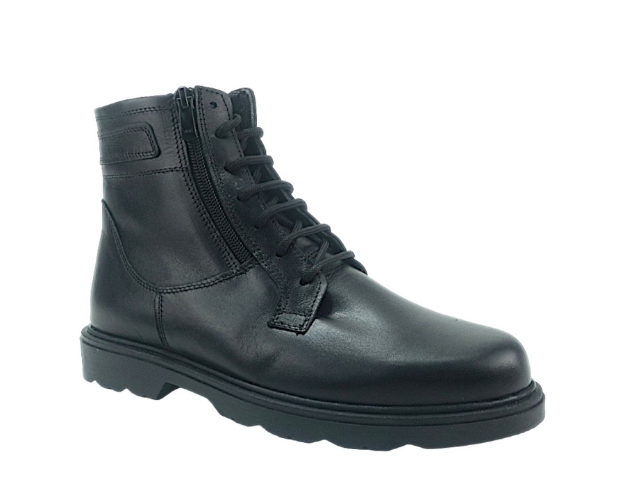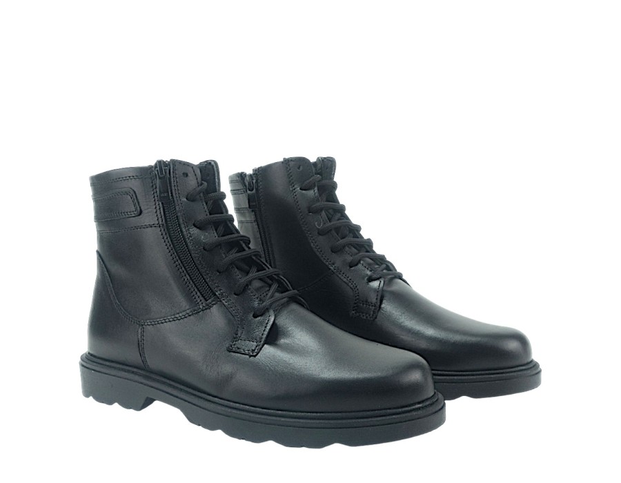 Ανδρικά δερμάτινα δετά μποτάκια σε χρώμα μαύρο με αντιολισθητική σόλα από την εταιρεία Steve Kommon. Διαθέτει κορδόνια αλλά και φερμουάρ για ευκολότερη εφαρμογή.