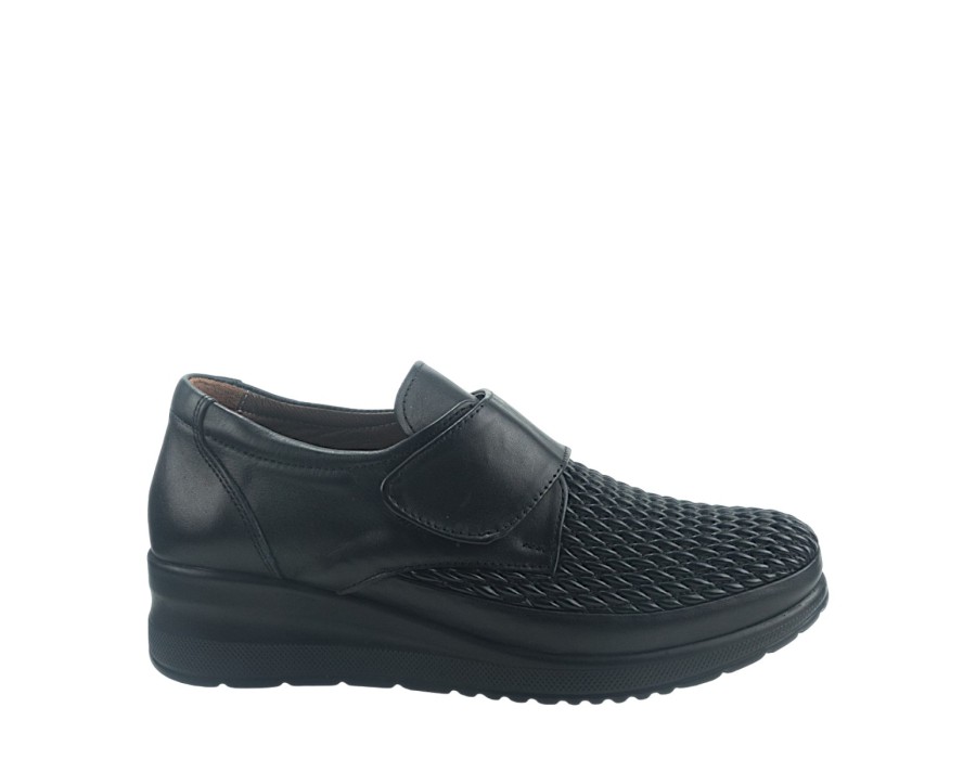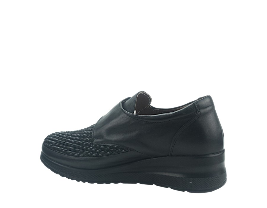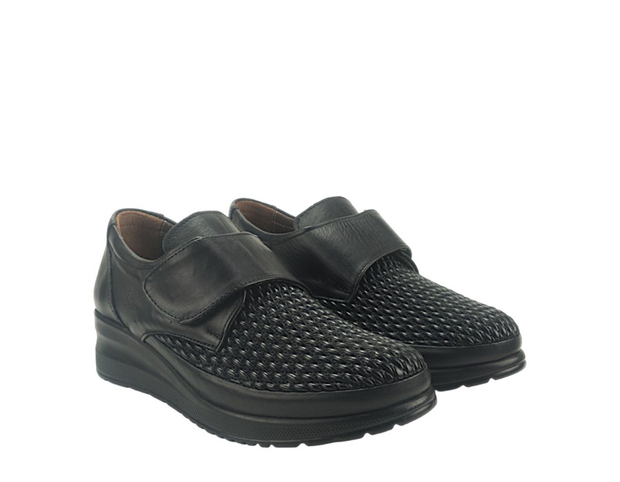 Γυναικεία loafers από δέρμα και ύφασμα σε μαύρο χρώμα. Διαθέτουν χαμηλό τακούνι για άνετα βήματα.