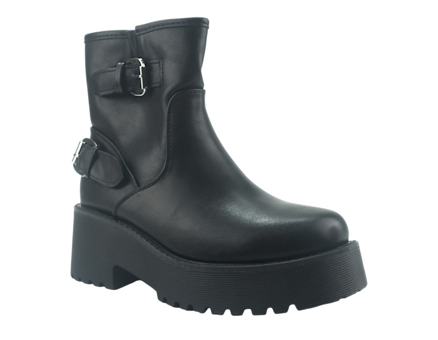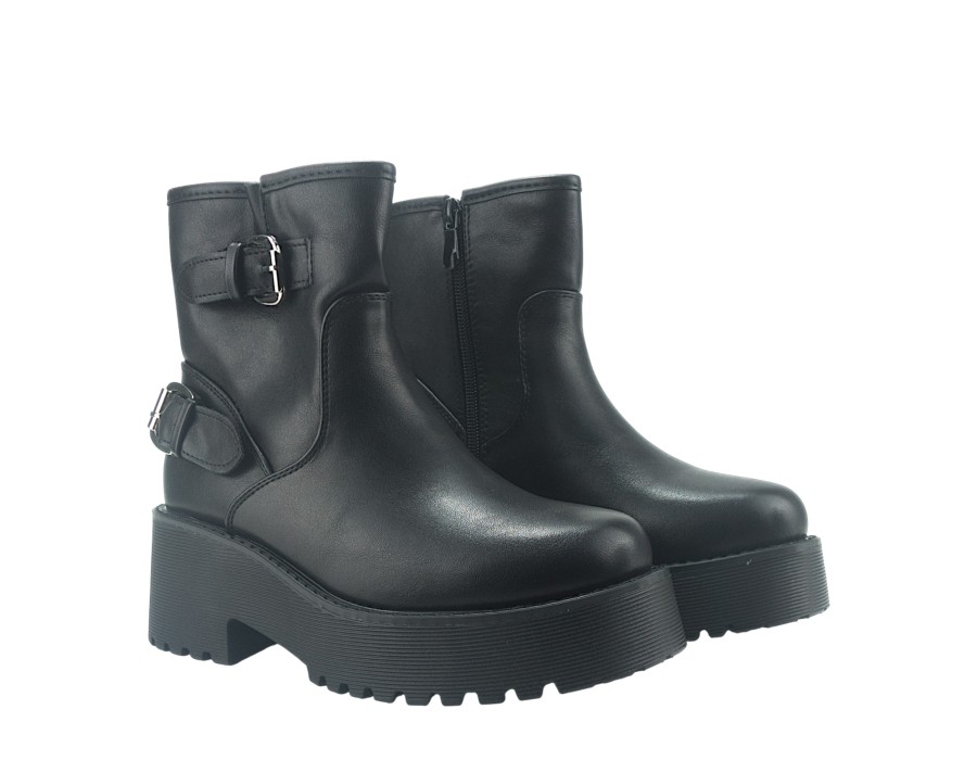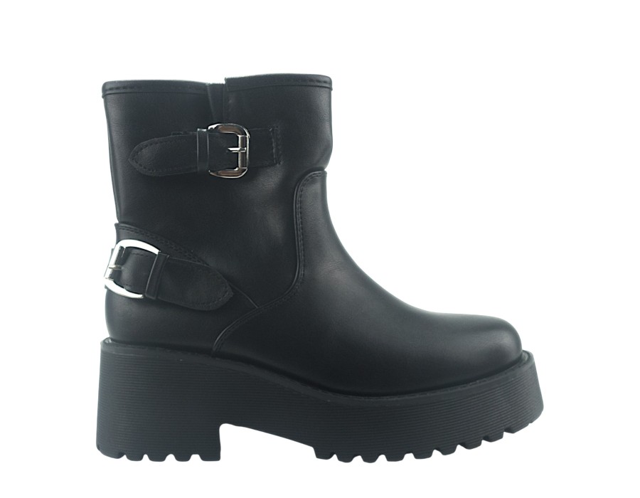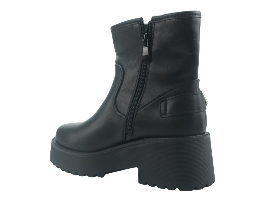Γυναικείο μποτάκι σε μαύρο χρώμα. Κατασκευασμένο από συνθετικό δέρμα υψηλής ποιότητας. Το ύψος του τακουνιού είναι 6.5 εκ.