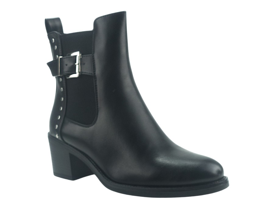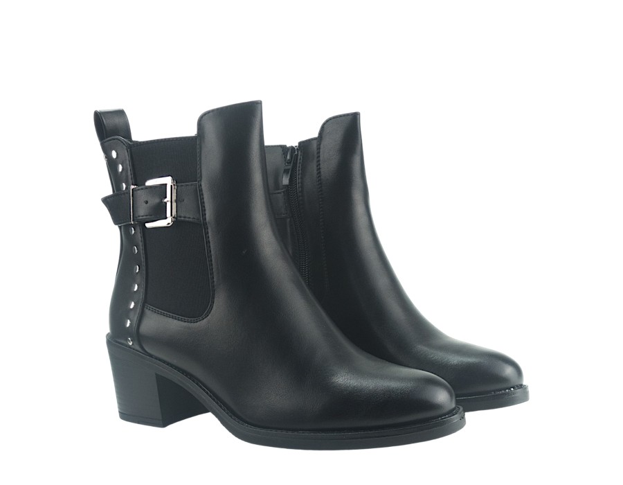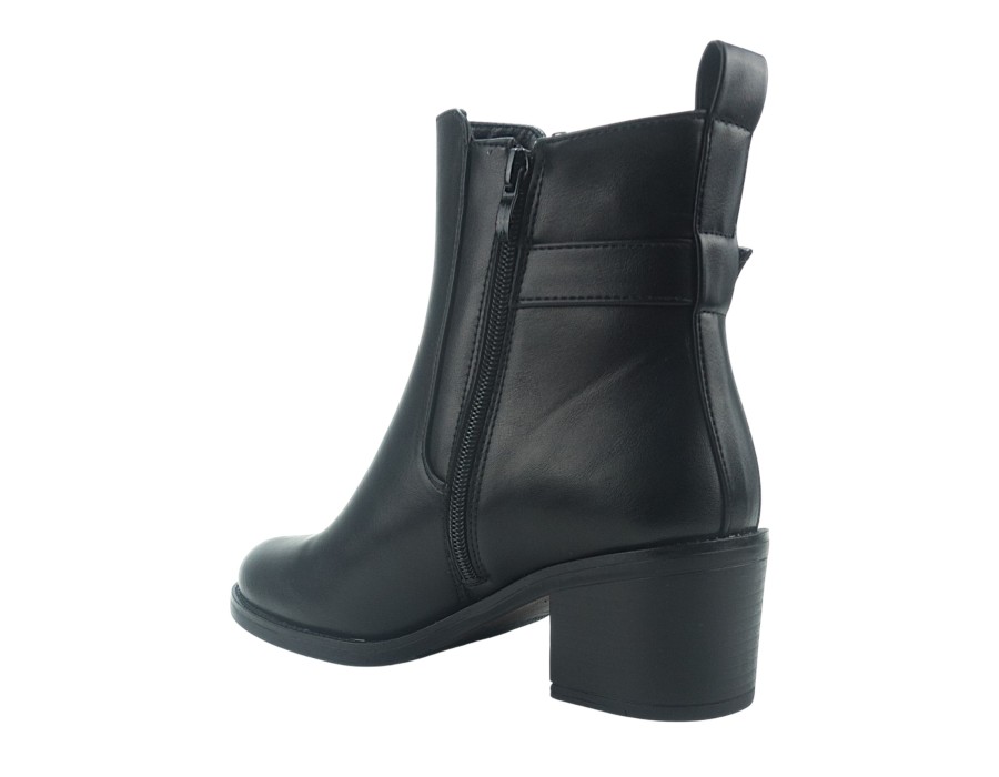 Γυναικείο μποτάκι σε μαύρο χρώμα. Κατασκευασμένο από συνθετικό δέρμα υψηλής ποιότητας. Το ύψος του τακουνιού είναι 6 εκ.