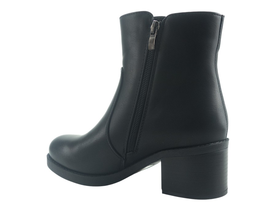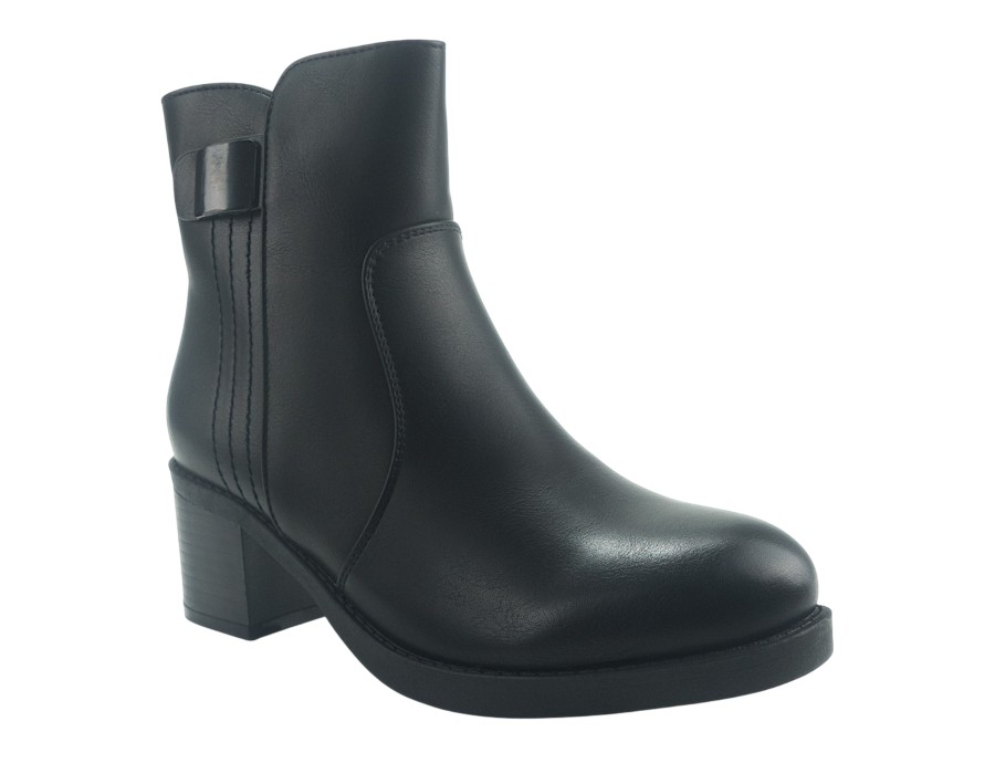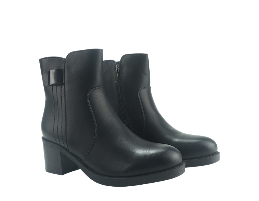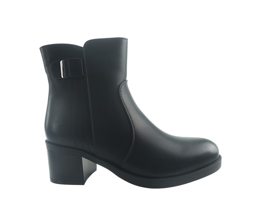 Γυναικείο μποτάκι σε μαύρο χρώμα. Κατασκευασμένο από συνθετικό δέρμα υψηλής ποιότητας. Το ύψος του τακουνιού είναι 6 εκ.