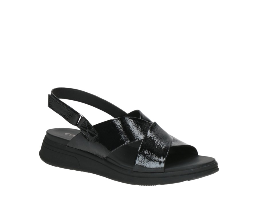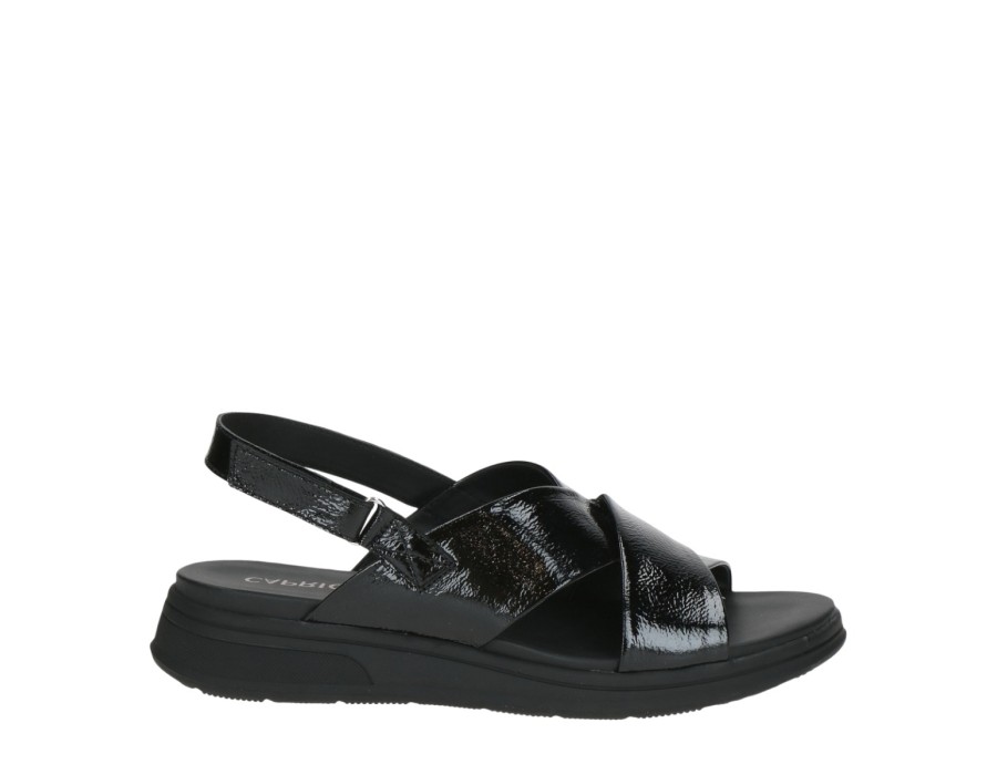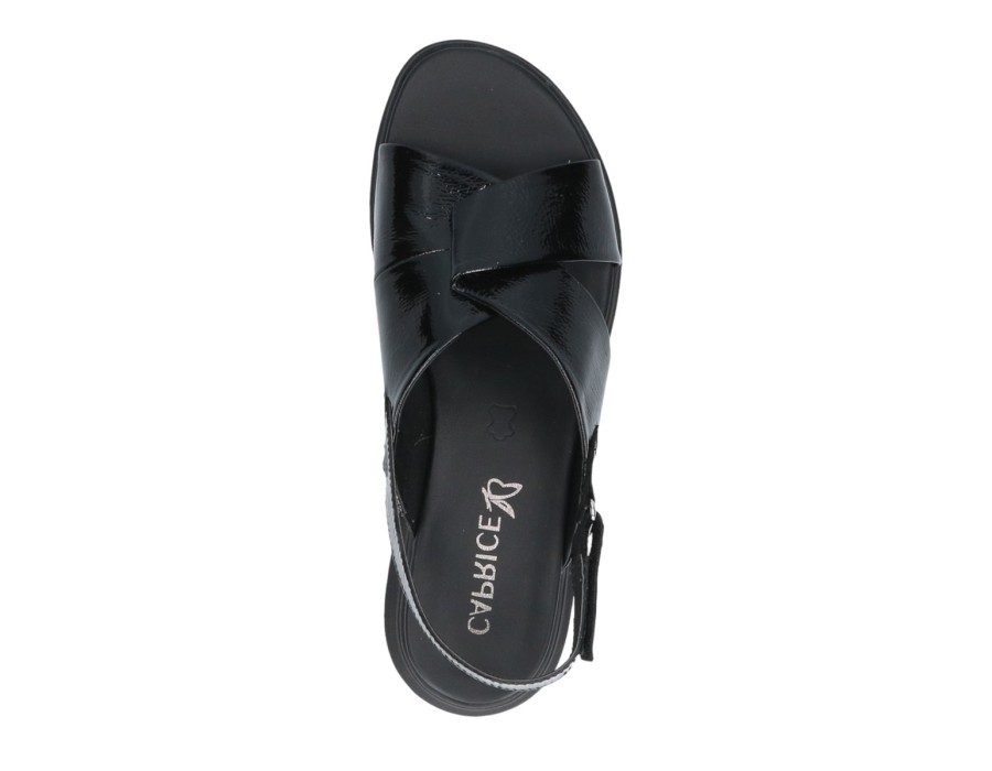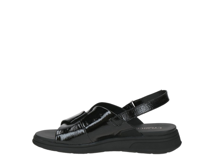 Γυναικεία σανδάλια με λουράκι που δένει γύρω από τον αστράγαλο, της εταιρίας Caprice. Είναι κατασκευασμένα από δέρμα και λουστρίνι, ένα υλικό που αναπνέει βοηθώντας στην αποφυγή δυσάρεστων οσμών, ενώ παράλληλα καθαρίζεται εύκολα. Προσαρμόζονται στη φόρμα του ποδιού παρέχοντας επιπλέον άνεση.