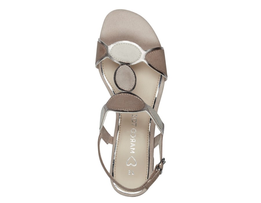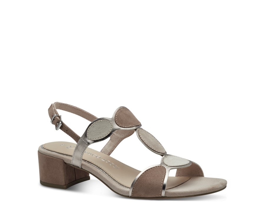 Γυναικείo πέδιλο από συνδυασμό γήινων χρωμάτων της εταιρείας Marco Tozzi, κατασκευασμένο από συνθετικό δέρμα και ύφασμα, με τακούνι ύψους 4,5 εκατοστών