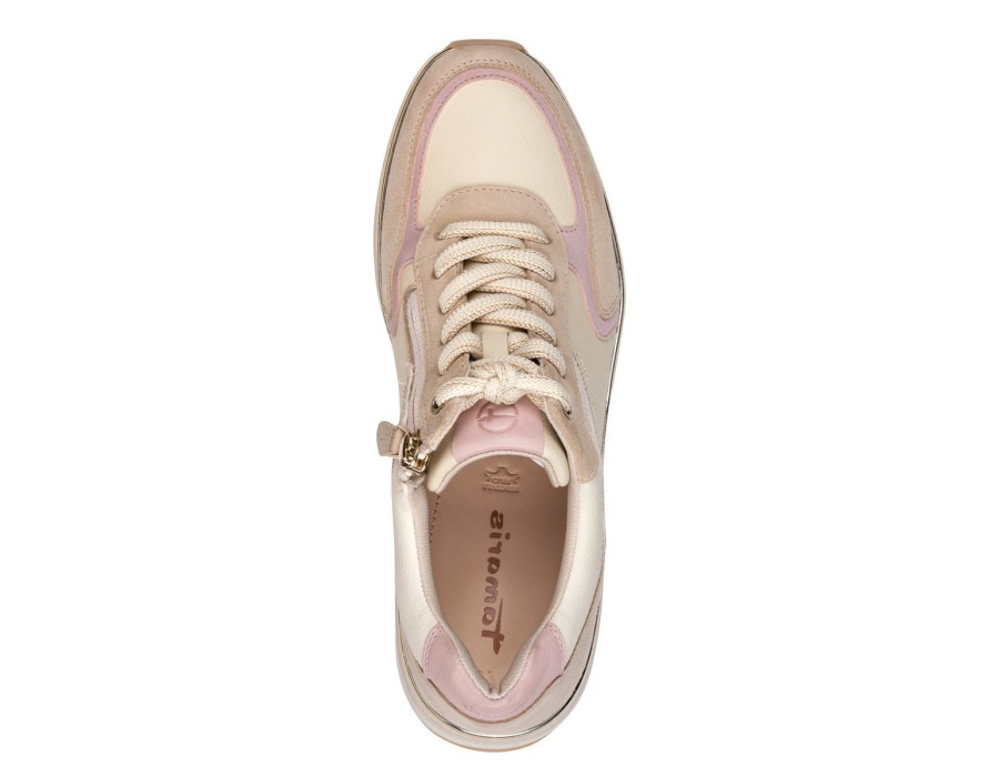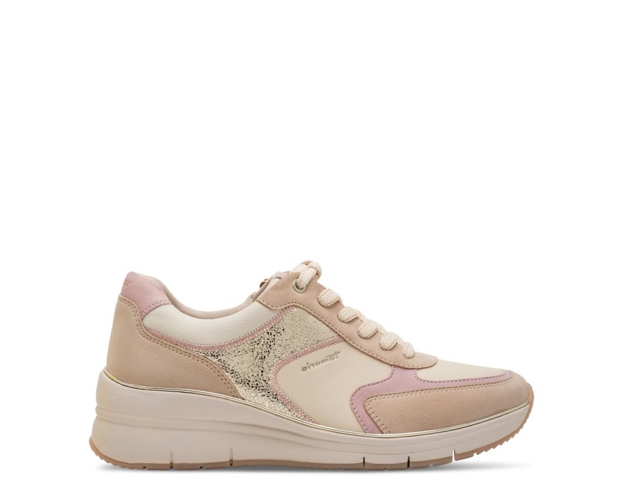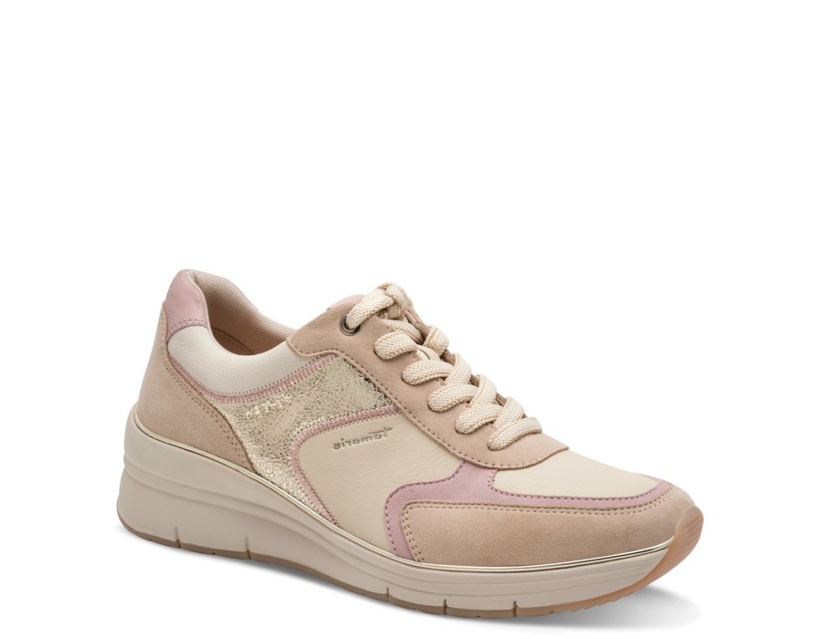 Casual Tamaris κατασκευασμένα από δέρμα και υψηλής ποιότητας συνθετικό δέρμα, με κορδόνι στο κέντρο και ενισχυμένο μαξιλαράκι στη φτέρνα. Ελαφριά, αντιολισθητική σφήνα σόλα 6 εκ. και ενισχυμένος δερμάτινος πάτος για άνετο πάτημα.