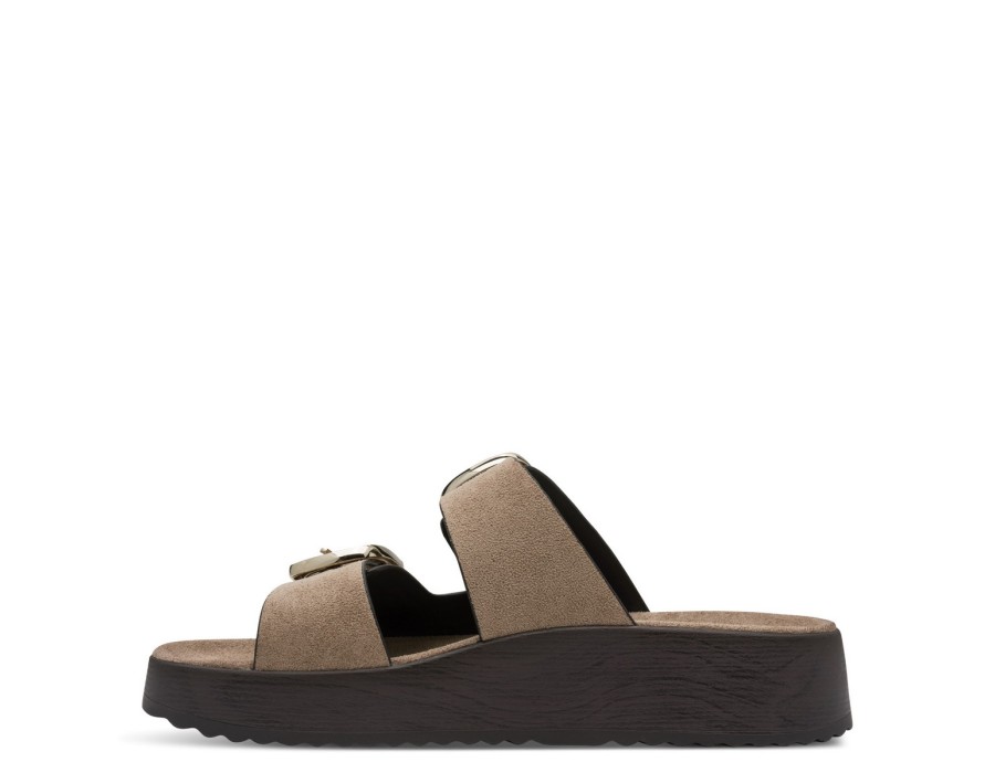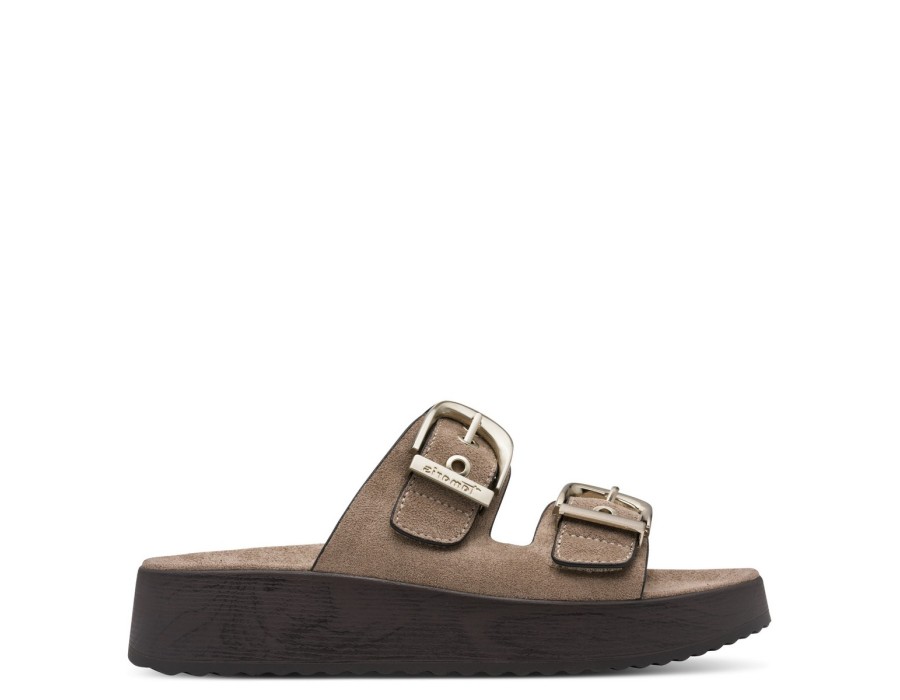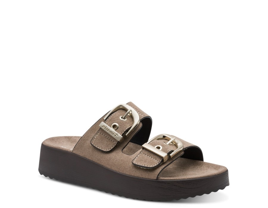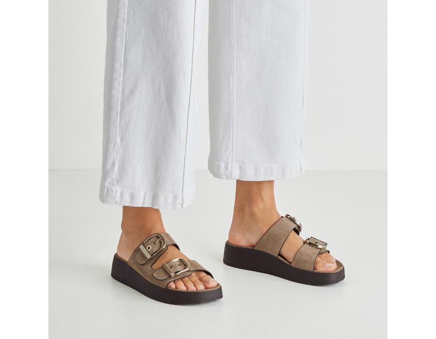 Γυναικείο σανδάλι σε χρώμα πούρου, είναι κατασκευασμένο από ύφασμα που το καθιστά πολύ άνετο και μαλακό. Το ύψος του τακουνιού είναι 5 εκ.