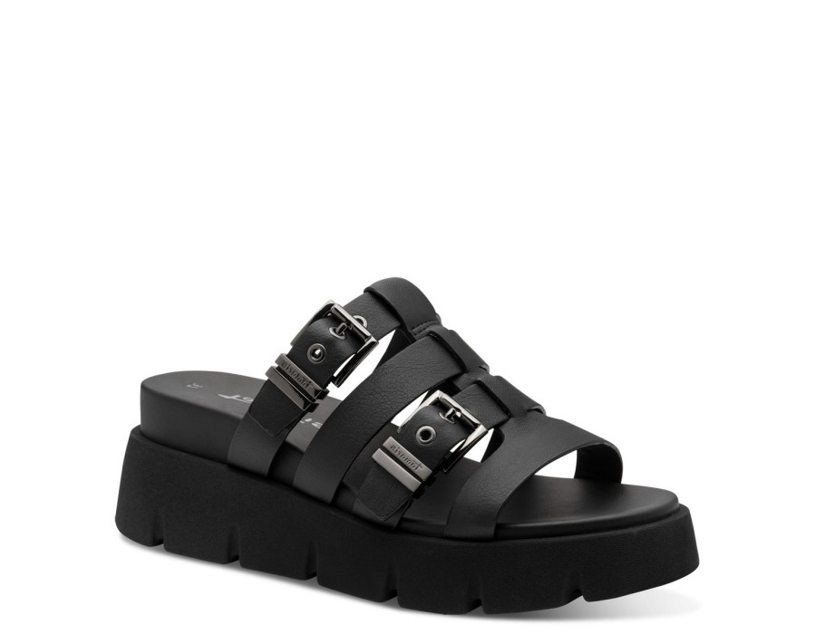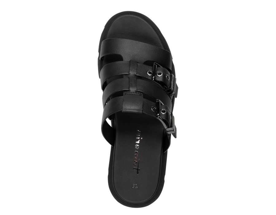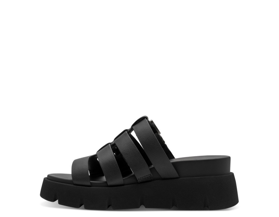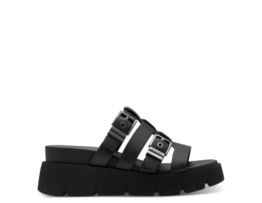 Γυναικείο σανδάλι σε μαύρο χρώμα, είναι κατασκευασμένο από συνθετικό δέρμα που το καθιστά πολύ άνετο και μαλακό. Το ύψος του τακουνιού είναι 4 εκ.