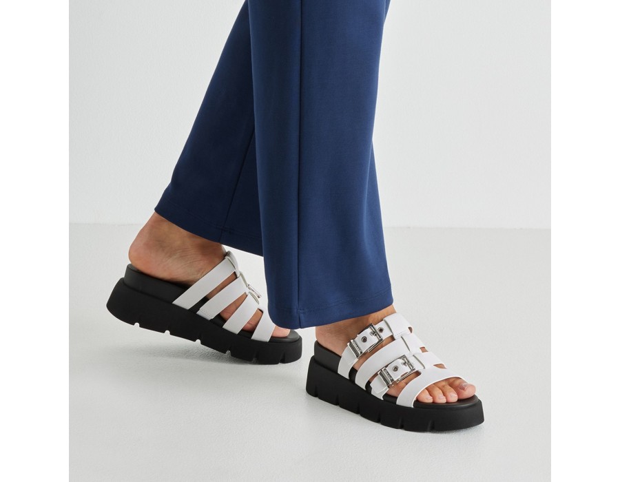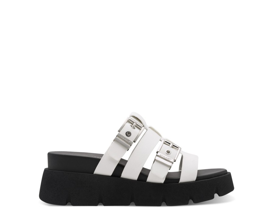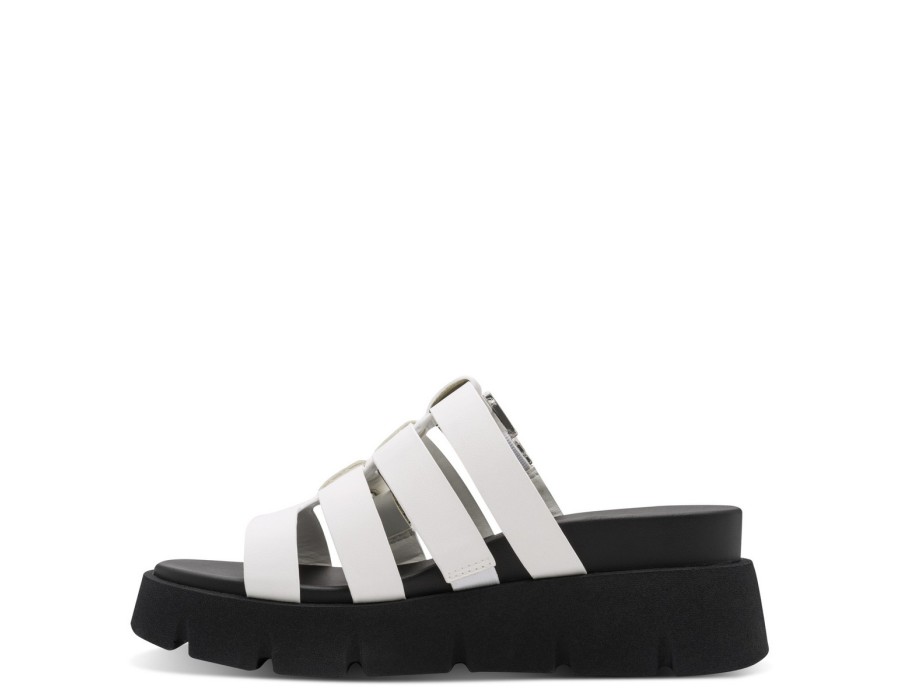 Γυναικείο σανδάλι σε συνδυασμό λευκού και μαύρου χρώματος, είναι κατασκευασμένο από συνθετικό δέρμα που το καθιστά πολύ άνετο και μαλακό. Το ύψος του τακουνιού είναι 4 εκ.