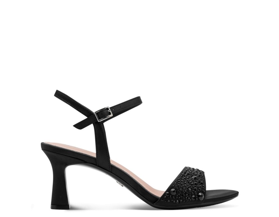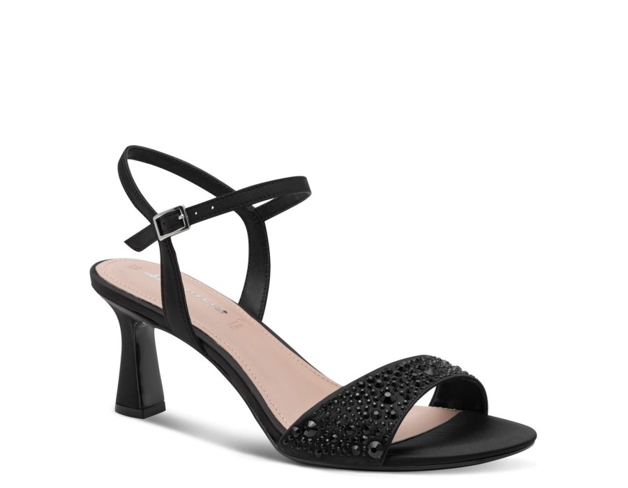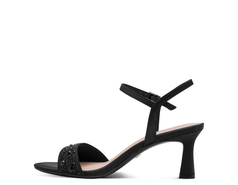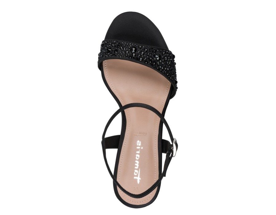Γυναικείo πέδιλο της εταιρείας Tamaris υφασμάτινο με τακούνι ύψους 7,5 εκατοστών σε μαύρο χρώμα με μαύρα στρας. Διαθέτουν τεχνολογία TOUCH-IT/Anti-Slide με μαλακό πάτο για πιο ξεκούραστο περπάτημα