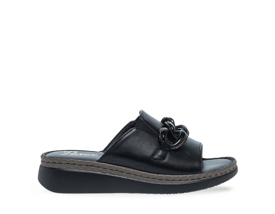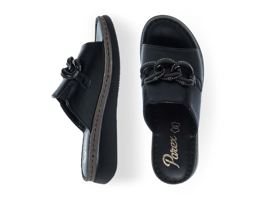 Γυναικεία σανδάλια Parex. Ξεχώρισε στο καθημερινό σου στιλ με αυτά τα γυναικεία σανδάλια από την Parex. Διαθέσιμα σε μαύρο χρώμα. Διαθέτουν φαρδιά φάσα με πρωτότυπο σχέδιο αλυσίδα στο πάνω μέρος. Μαλακός πάτος και ανθεκτική σόλα που δεν γλιστράει. Πρόσθεσε στην καλοκαιρινή σου συλλογή αυτά τα γυναικεία σανδάλια Parex από συνθετικό δέρμα εξαιρετικής ποιότητας.