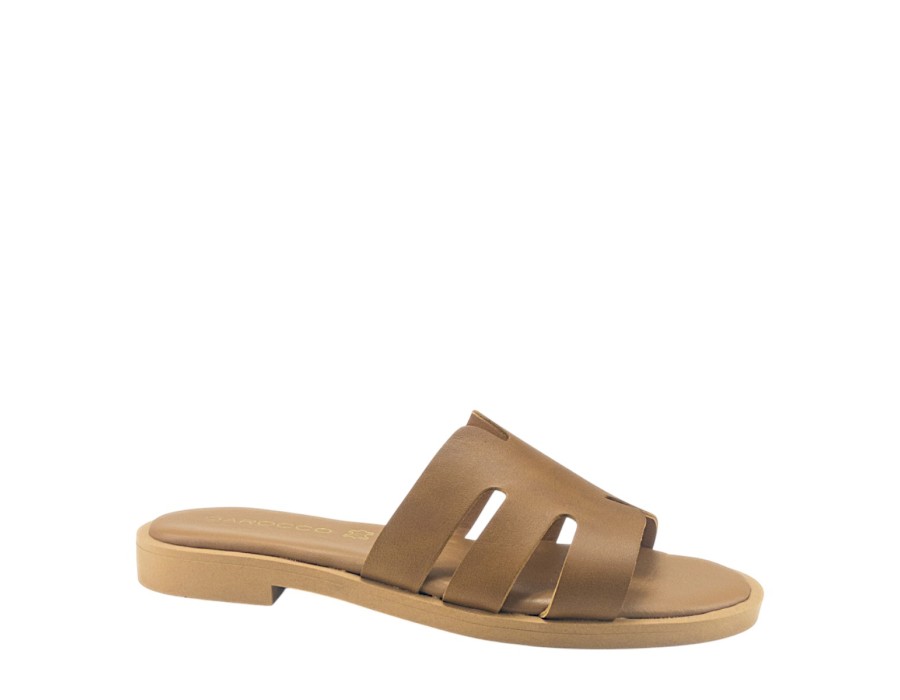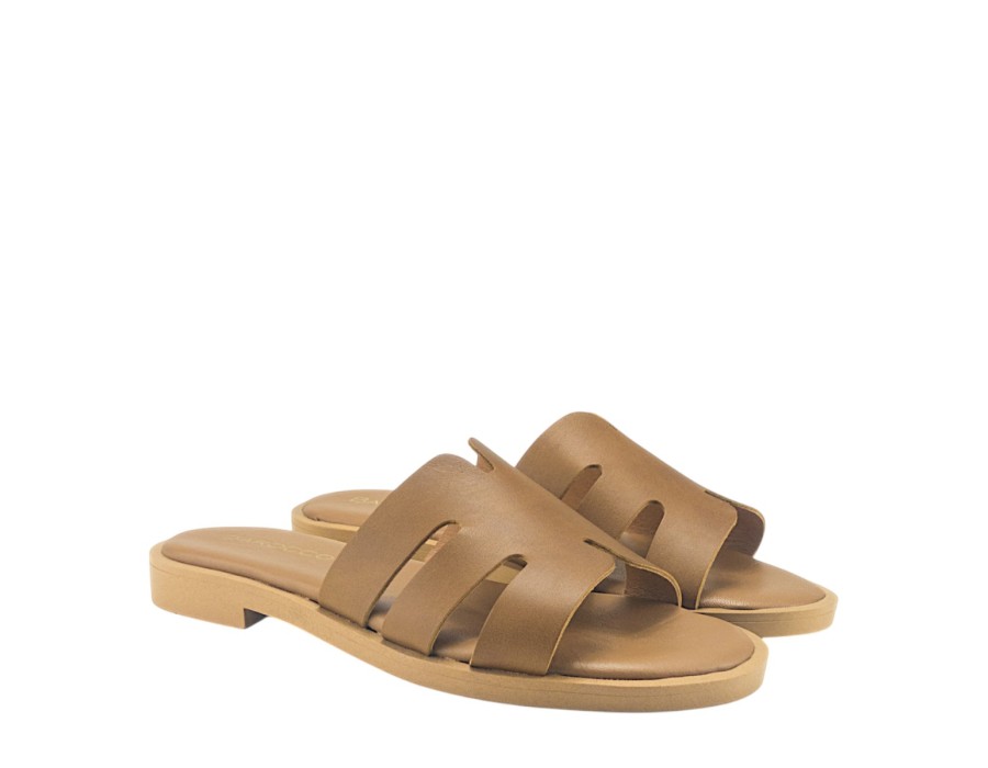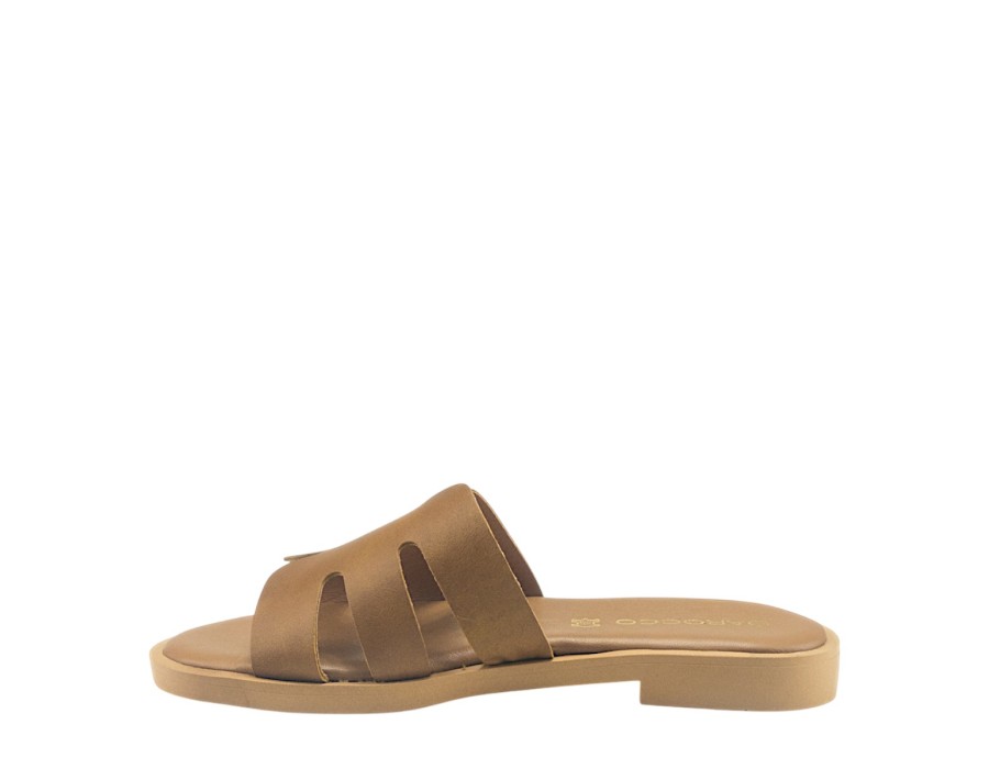 Γυναικείο σανδάλι σε ταμπά χρώμα, είναι κατασκευασμένο από δέρμα και συνθετικό δέρμα που το καθιστά πολύ άνετο και πολύ μαλακό. Το ύψος του τακουνιού είναι 2 εκ.
