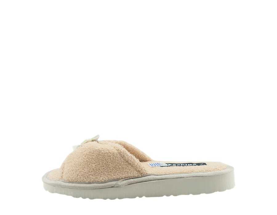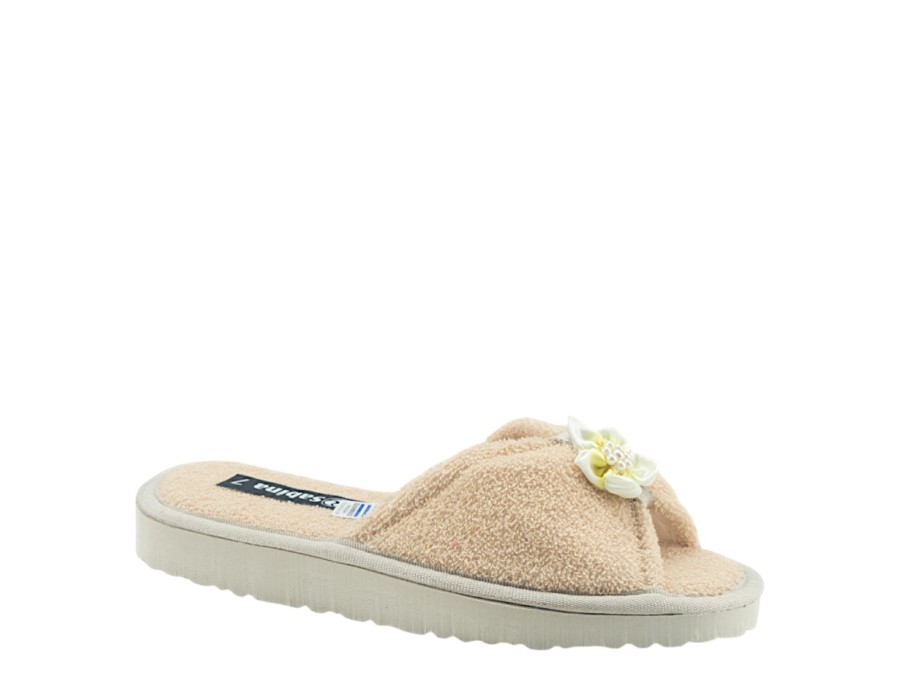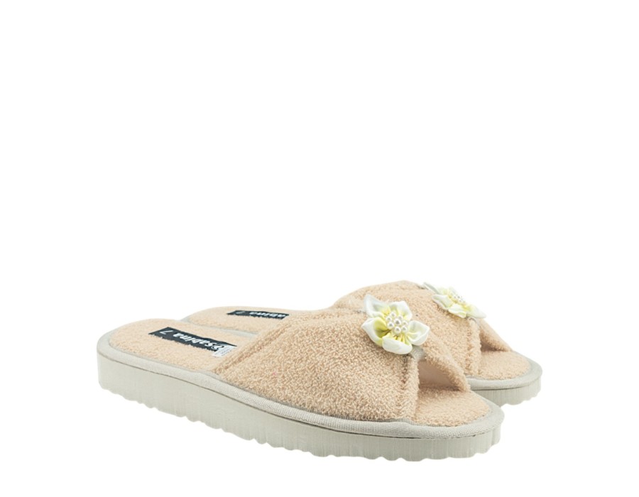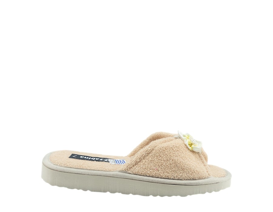 Γυναικείες εξώφτερνες παντόφλες από την ανοιξιάτικη συλλογή της SABINA, σε μπεζ χρώμα. Στιλάτες ανοιξιάτικες παντόφλες, προσφέρουν άνεση και δροσερή αίσθηση ενώ είναι χαρακτηριστικά μαλακές στο πάτημα. Κατασκευασμένες από πρώτης ποιότητας ύφασμα και αντιολισθητικό πάτο από συνθετικό υλικό.