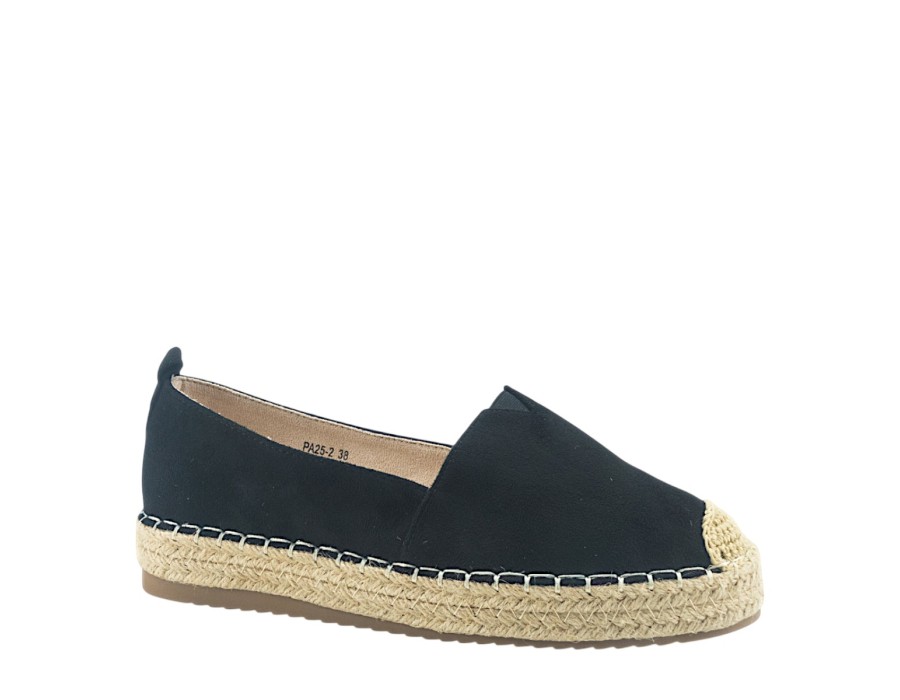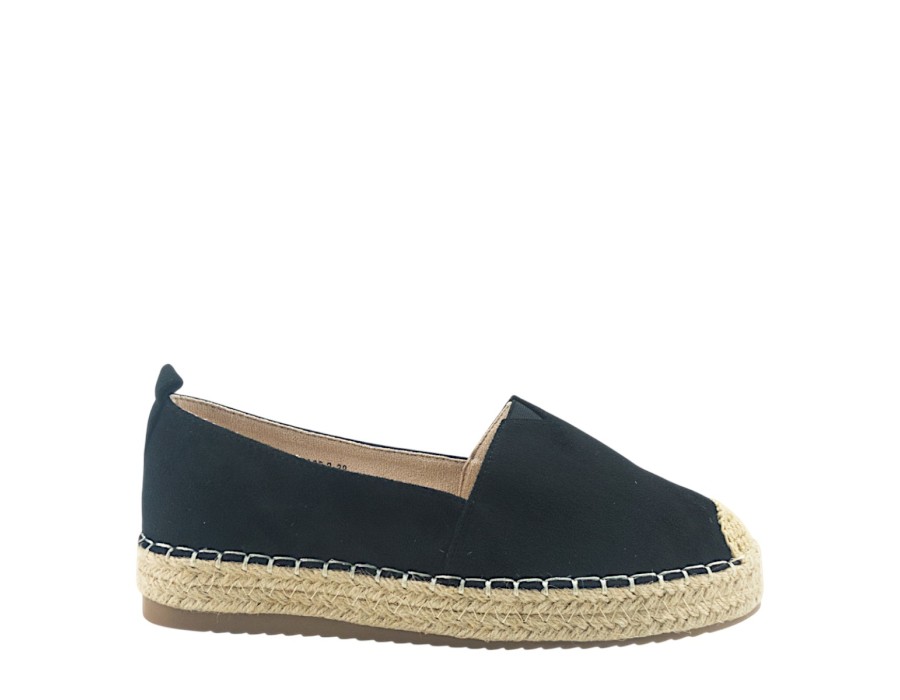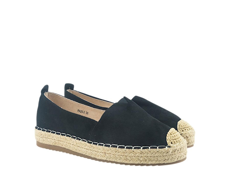 Το ανάλαφρο σχέδιο που διαθέτουν αυτές οι καλοκαιρινές εσπαντρίγιες, κερδίζει αμέσως την προτίμηση κάθε γυναίκας για τα φετινά καλοκαιρινά της παπούτσια. Ιδανικές για όλο το 24ωρο για άνεση στα πόδια. Κλασικό σχοινί πάνω από τη λαστιχένια σόλα με χαμηλό τακούνι 3 cm. Μπορούν να υποστηρίξουν πολλά casual style με το μαύρο χρώμα τους να δίνει την ευκαιρία για υπέροχους μοδάτους καλοκαιρινούς συνδυασμούς.