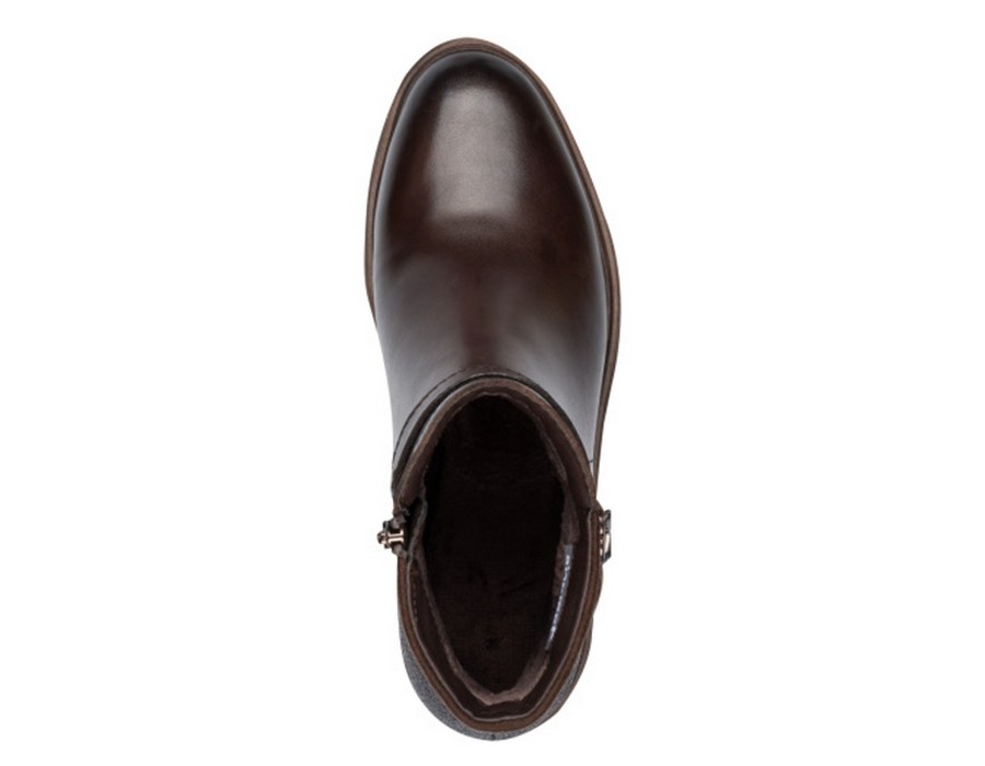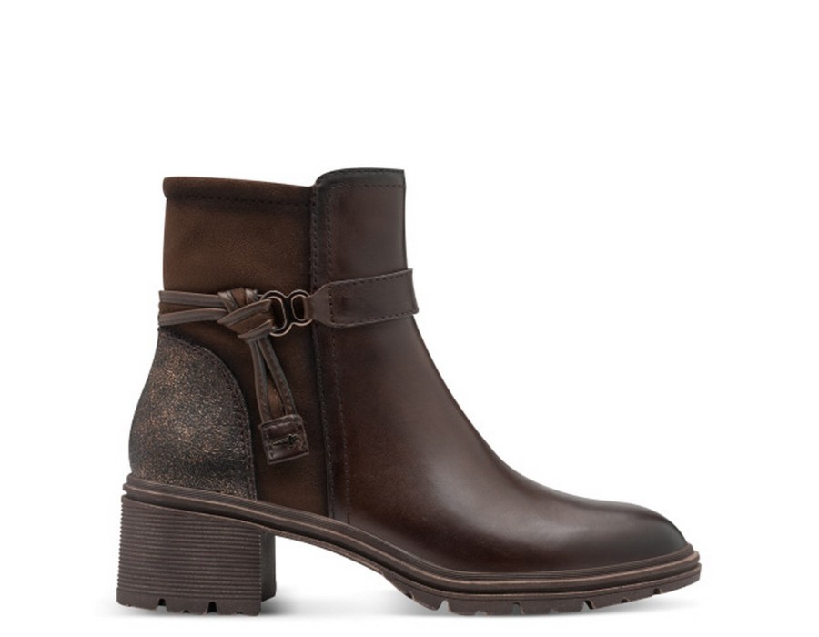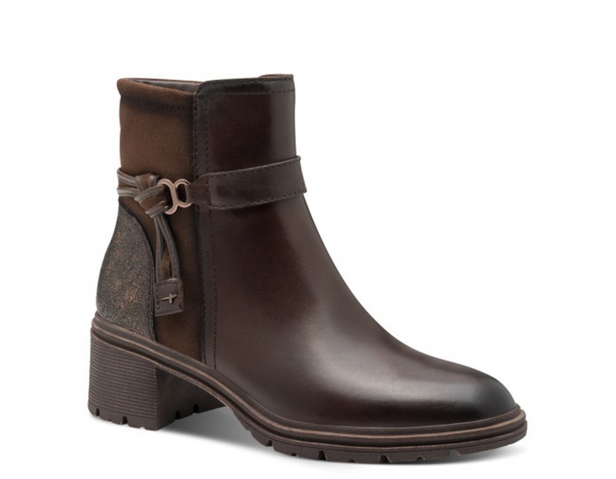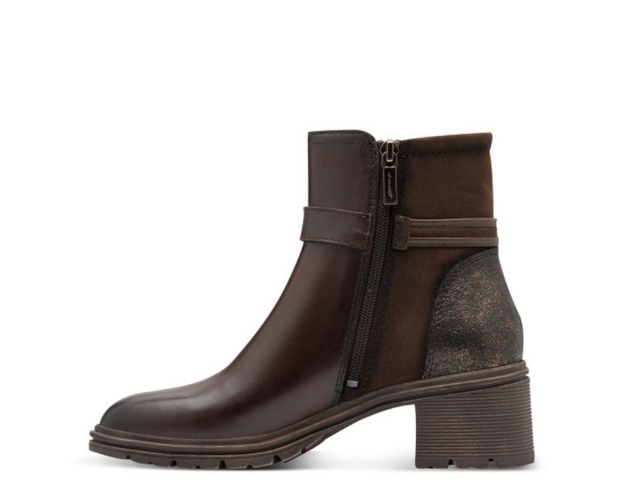 Γυναικείο μποτάκι σε καφέ χρώμα από τον οίκο Tamaris. Κατασκευασμένο από συνθετικό δέρμα, ύφασμα και δέρμα. Διαθέτει τεχνολογία Touch-it που το καθιστά αντιολισθητικό με μαλακό πάτο. Το ύψος του τακουνιού είναι 4 εκ.
