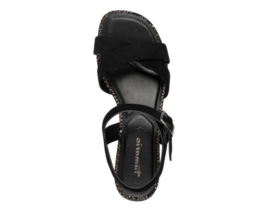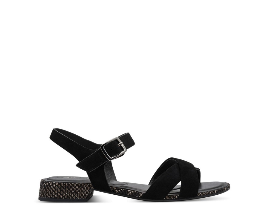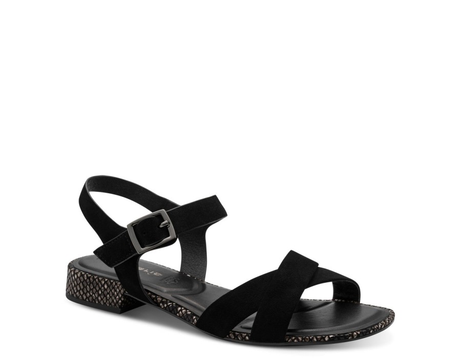 Γυναικείο σανδάλι σε μαύρο χρώμα με snake print, είναι κατασκευασμένο από δέρμα που το καθιστά πολύ άνετο και μαλακό. Είναι εξοπλισμένο με την τεχνολογία Anti-Slide με αντιολισθητικό πάτο για πιο ασφαλές περπάτημα. Το ύψος του τακουνιού είναι 2 εκ.