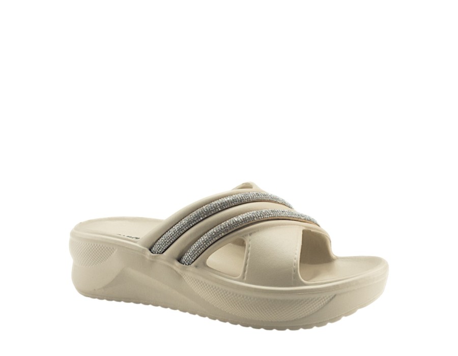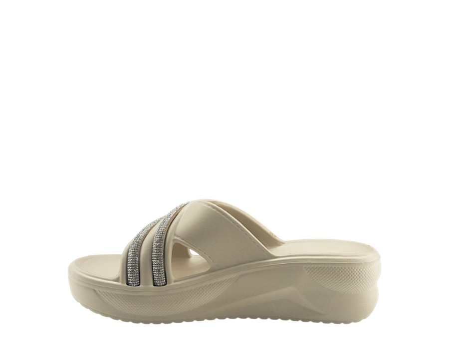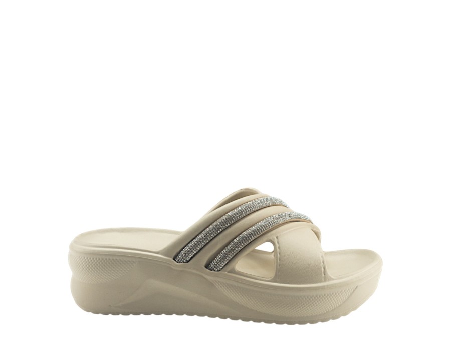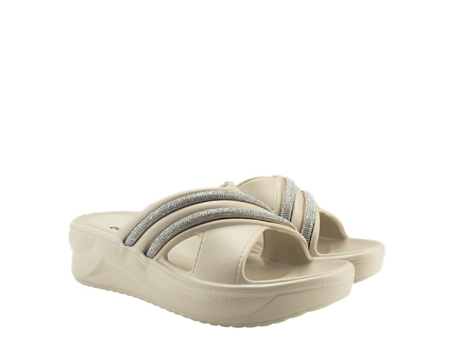Μονόχρωμες γυναικείες παντόφλες θαλάσσης με λουριά που αγκαλιάζουν το κουντεπιέ σας. Είναι κατασκευασμένες από πλαστικό με αστραφτερές λεπτομέρειες στα λουριά. Καθαρίζουν εύκολα και έχουν εύκολη εφαρμογή.