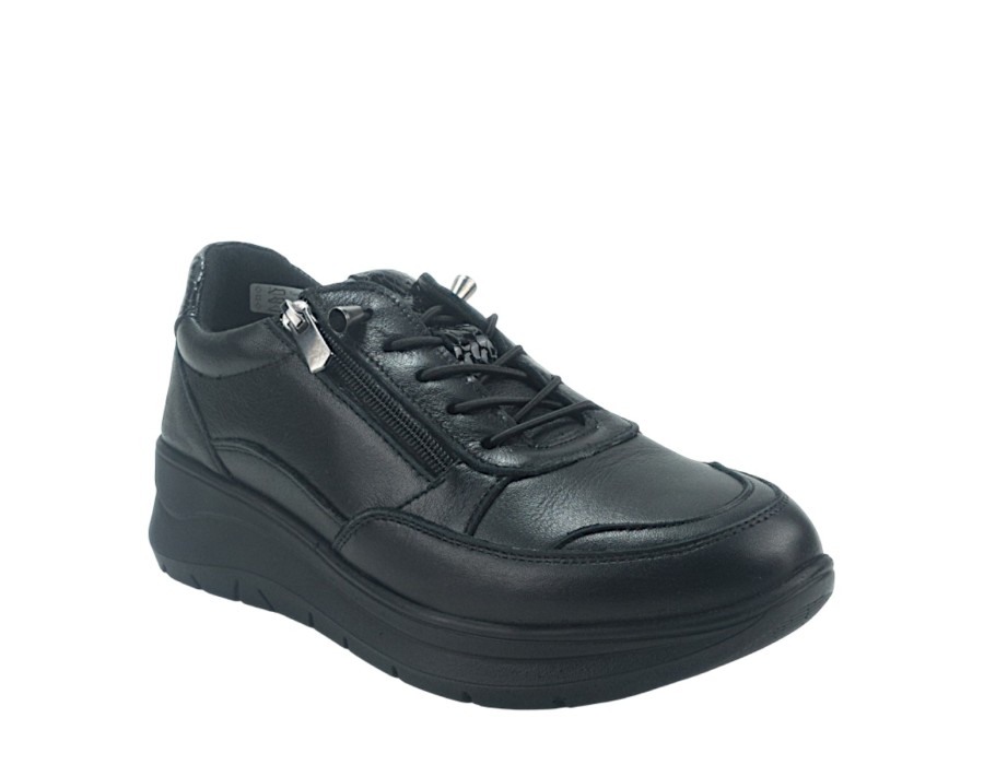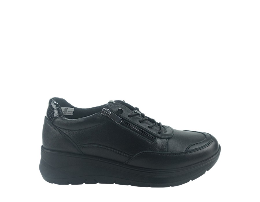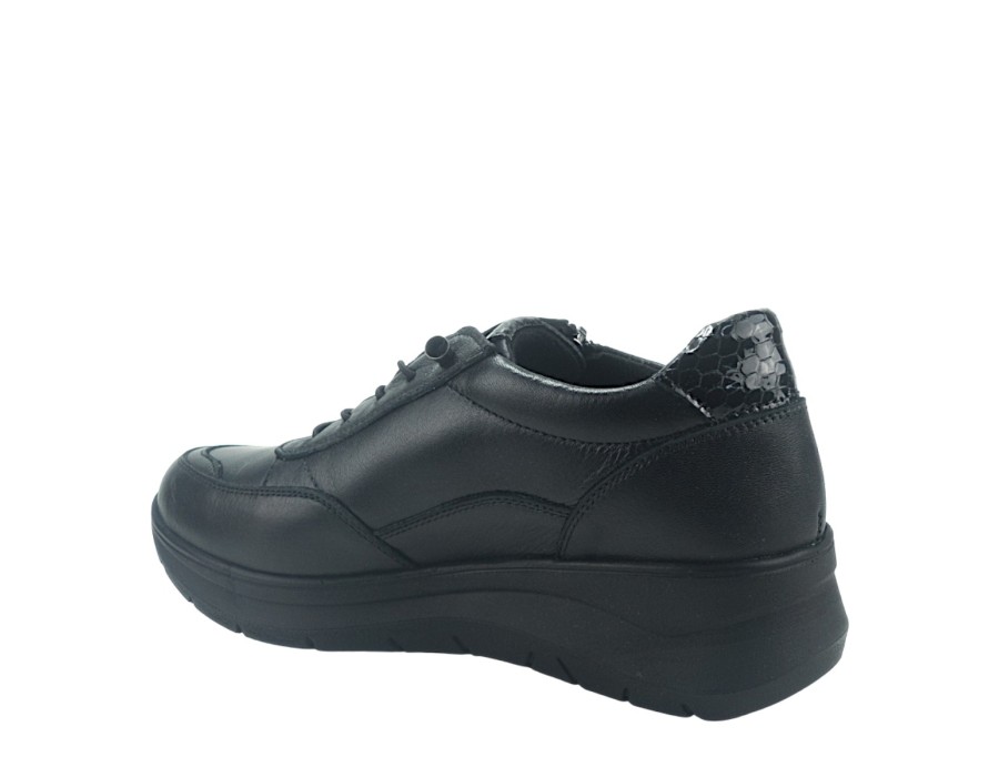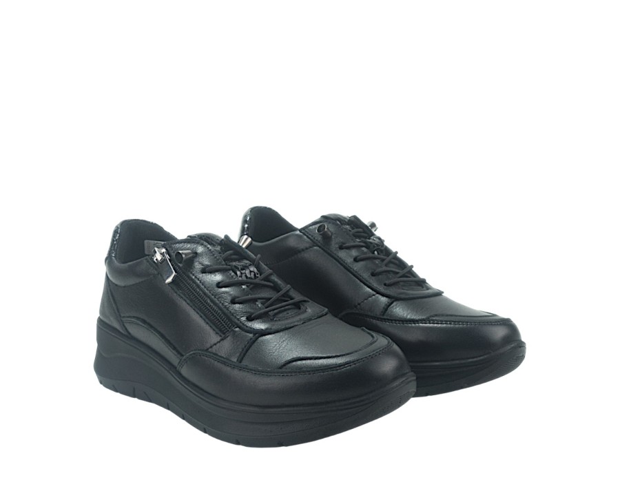Γυναικεία sneakers από συνθετικό δέρμα και δέρμα σε μαύρο χρώμα. Διαθέτουν χαμηλό τακούνι για άνετα βήματα