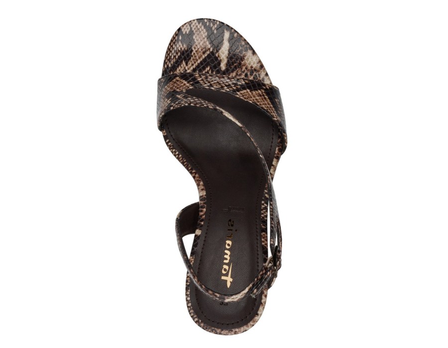 Γυναικεία πέδιλα της εταιρείας Tamaris με snake print, υφασμάτινα, εξοπλισμένα με την τεχνολογία TOUCH-IT που τα καθιστά πολύ άνετα καθώς διαθέτουν έναν πολύ μαλακό πάτο. Διαθέτουν τακούνι 10 cm.