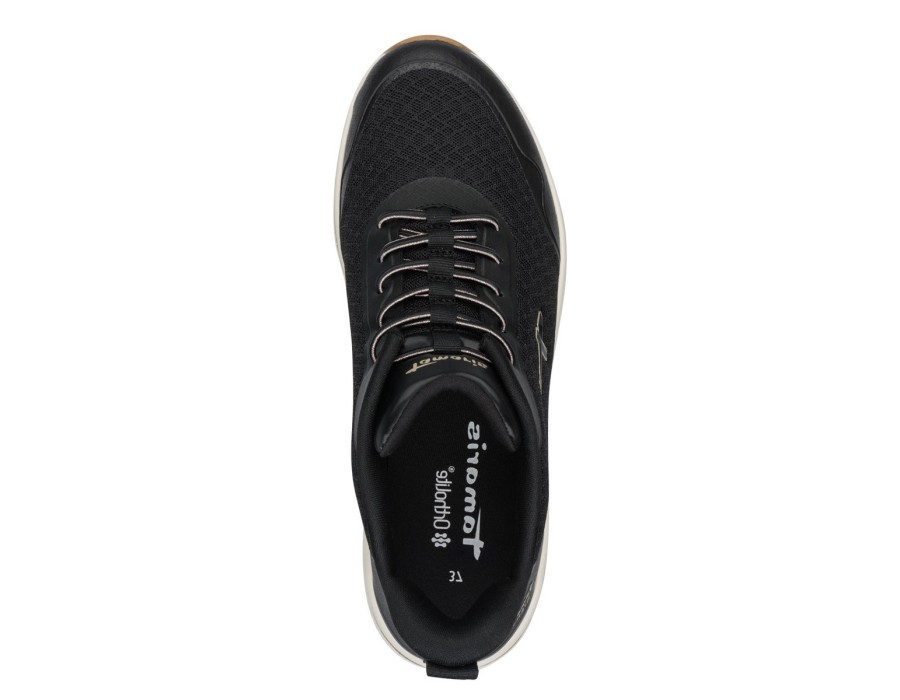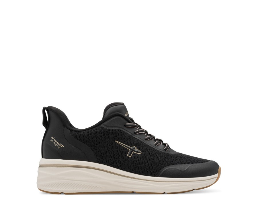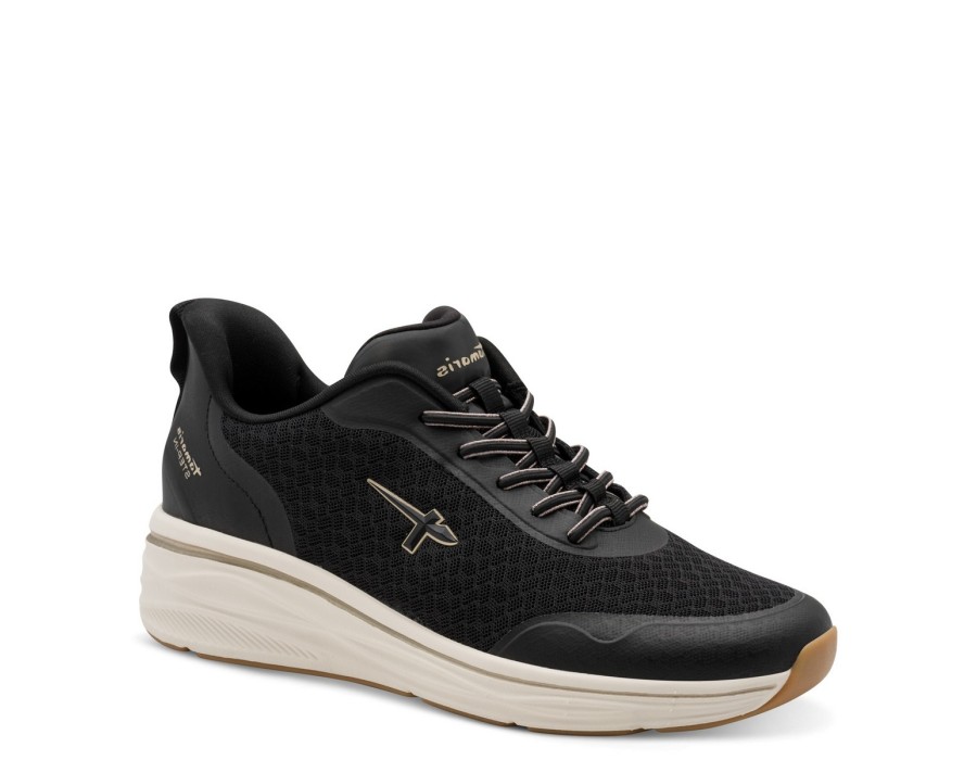 Γυναικεία sneakers Tamaris, δετά για σταθερή εφαρμογή σε διαχρονικό μαύρο χρώμα και συνδυασμό υλικών: συνθετικό δέρμα και ύφασμα που θα σας ενθουσιάσει και θα δώσει στις εμφανίσεις σας ένα glam ύφος. Με πλατφόρμα με ύψος τακουνιού 5 εκ. για μέγιστη άνεση στο βάδισμα. Διαθέτουν επίσης την τεχνολογία STEP-IN που προσφέρει άμεση ευκολία.Χάρη στο καινοτόμο εύκαμπτο υλικό στο πίσω μέρος του παπουτσιού και στα ελαστικά κορδόνια , κάθε είσοδος είναι γρήγορη και εύκολη.